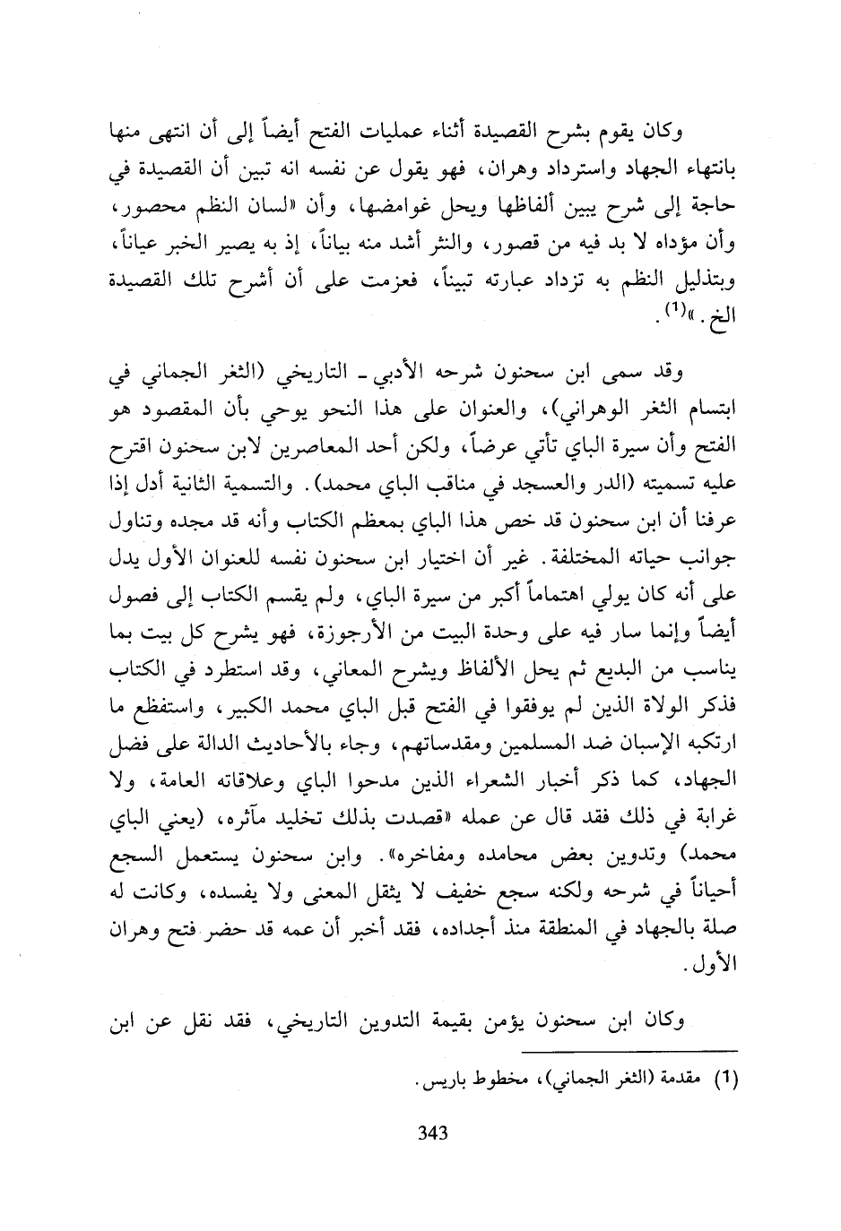 وقد سمى ابن سحنون شرحه الأدبي - التاريخي (الثغر الجماني في ابتسام الثغر الوهراني)، والعنوان على هذا النحو يوحي بأن المقصود هو الفتح وأن سيرة الباي تأتي عرضا، ولكن أحد المعاصرين لابن سحنون اقترح عليه تسميته (الدر والعسجد في مناقب الباي محمد). والتسمية الثانية أدل إذا عرفنا أن ابن سحنون قد خص هذا الباي بمعظم الكتاب وأنه قد مجده وتناول جوانب حياته المختلفة. غير أن اختيار ابن سحنون نفسه للعنوان الأول يدل على أنه كان يولي اهتماما أكبر من سيرة الباي، ولم يقسم الكتاب إلى فصول أيضا وإنما سار فيه على وحدة البيت من الأرجوزة، فهو يشرح كل بيت بما يناسب من البديع ثم يحل الألفاظ ويشرح المعاني، وقد استطرد في الكتاب فذكر الولاة الذين لم يوفقوا في الفتح قبل الباي محمد الكبير، واستفظع ما ارتكبه الإسبان ضد المسلمين ومقدساتهم، وجاء بالأحاديث الدالة على فضل الجهاد، كما ذكر أخبار الشعراء الذين مدحوا الباي وعلاقاته العامة، ولا غرابة في ذلك فقد قال عن عمله (قصدت بذلك تخليد مآثره، (يعني الباي محمد) وتدوين بعض محامده ومفاخره). وابن سحنون يستعمل السجع أحيانا في شرحه ولكنه سجع خفيف لا يثقل المعنى ولا يفسده، وكانت له صلة بالجهاد في المنطقة منذ أجداده، فقد أخبر أن عمه قد حضر فتح وهران الأول.