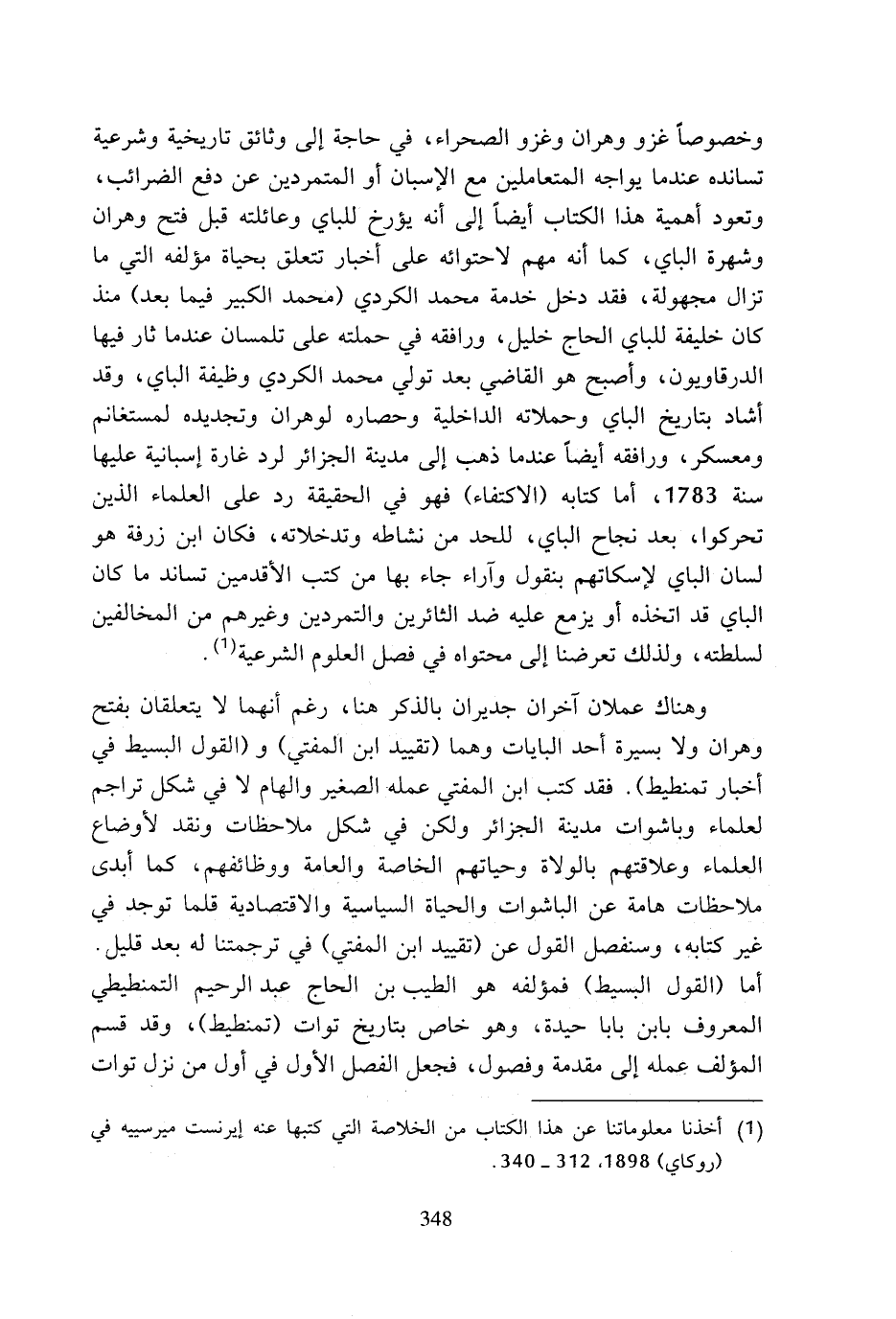 وهناك عملان آخران جديران بالذكر هنا، رغم أنهما لا يتعلقان بفتح وهران ولا بسيرة أحد البايات وهما (تقييد ابن المفتي) و (القول البسيط في أخبار تمنطيط). فقد كتب ابن المفتي عمله الصغير والهام لا في شكل تراجم لعلماء وباشوات مدينة الجزائر ولكن في شكل ملاحظات ونقد لأوضاع العلماء وعلاقتهم بالولاة وحياتهم الخاصة والعامة ووظائفهم، كما أبدى ملاحظات هامة عن الباشوات والحياة السياسية والاقتصادية قلما توجد في غير كتابه، وسنفصل القول عن (تقييد ابن المفتي) في ترجمتنا له بعد قليل. أما (القول البسيط) فمؤلفه هو الطيب بن الحاج عبد الرحيم التمنطيطي المعروف بابن بابا حيدة، وهو خاص بتاريخ توات (تمنطيط)، وقد قسم المؤلف عمله إلى مقدمة وفصول، فجعل الفصل الأول في أول من نزل توات