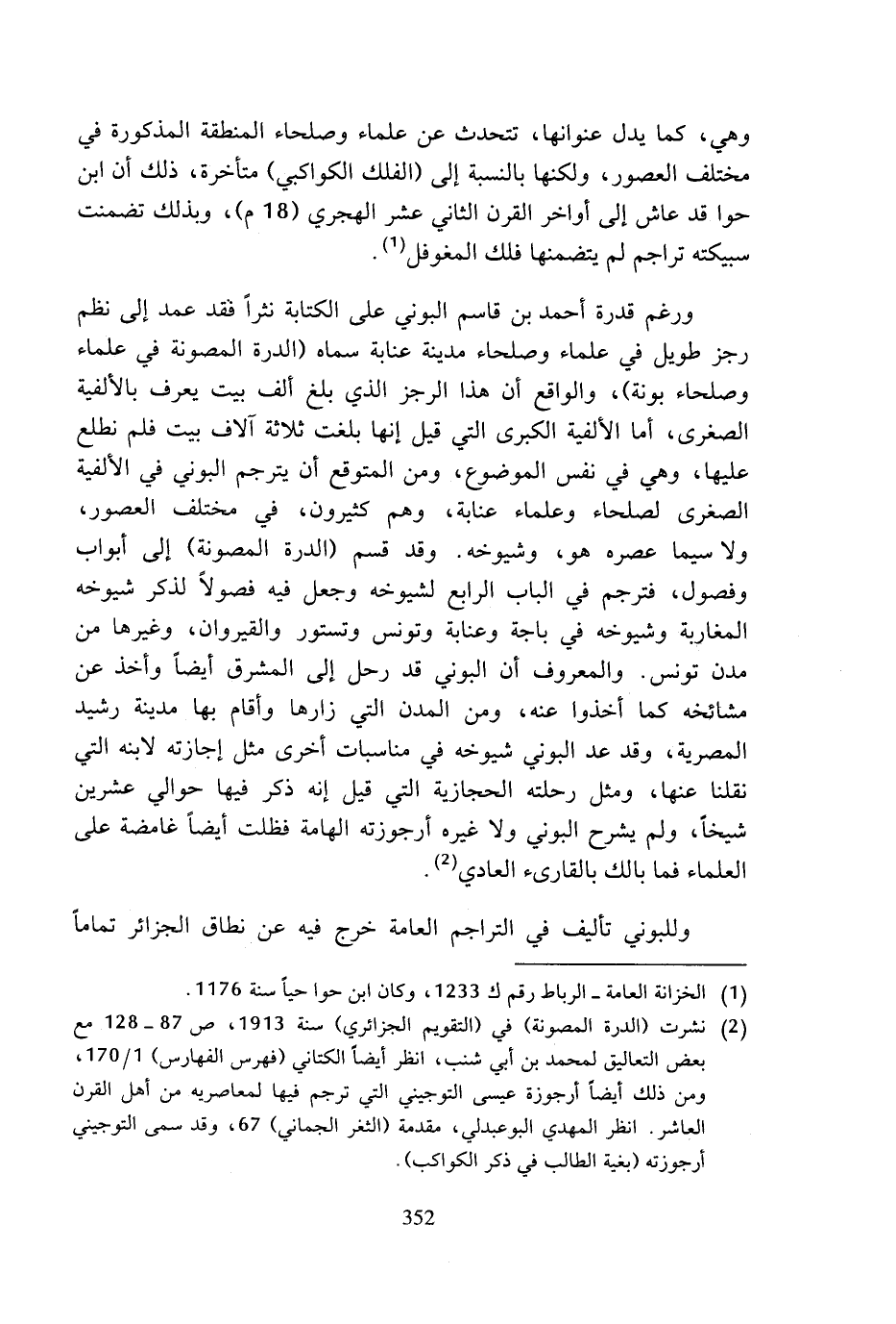 وللبوني تأليف في التراجم العامة خرج فيه عن نطاق الجزائر تماما
