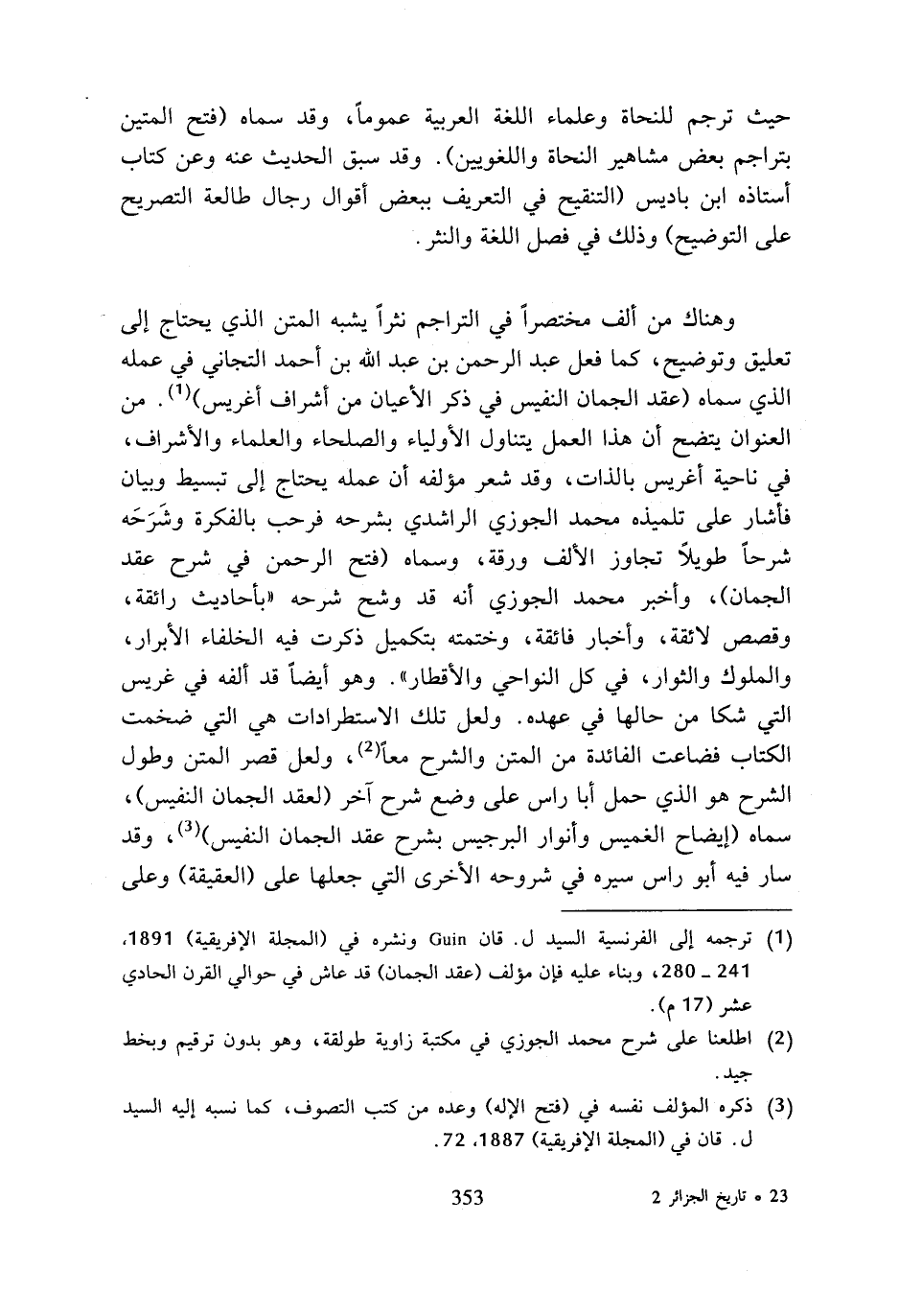 (¬1) ترجمه إلى الفرنسية السيد ل. قان Guin ونشره في (المجلة الإفريقية) 1891، 241 - 280، وبناء عليه فإن مؤلف (عقد الجمان) قد عاش في حوالي القرن الحادي عشر (17 م).
