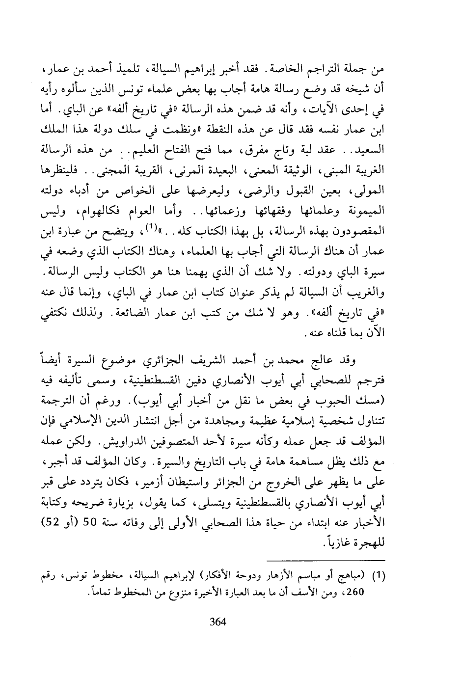الميمونة وعلمائها وفقهائها وزعمائها .. وأما العوام فكالهوام، وليس المقصودون بهذه الرسالة، بل بهذا الكتاب كله ..) (¬1)، ويتضح من عبارة ابن عمار أن هناك الرسالة التي أجاب بها العلماء، وهناك الكتاب الذي وضعه في سيرة الباي ودولته. ولا شك أن الذي يهمنا هنا هو الكتاب وليس الرسالة. والغريب أن السيالة لم يذكر عنوان كتاب ابن عمار في الباي، وإنما قال عنه (في تاريخ ألفه). وهو لا شك من كتب ابن عمار الضائعة. ولذلك نكتفي الآن بما قلناه عنه.