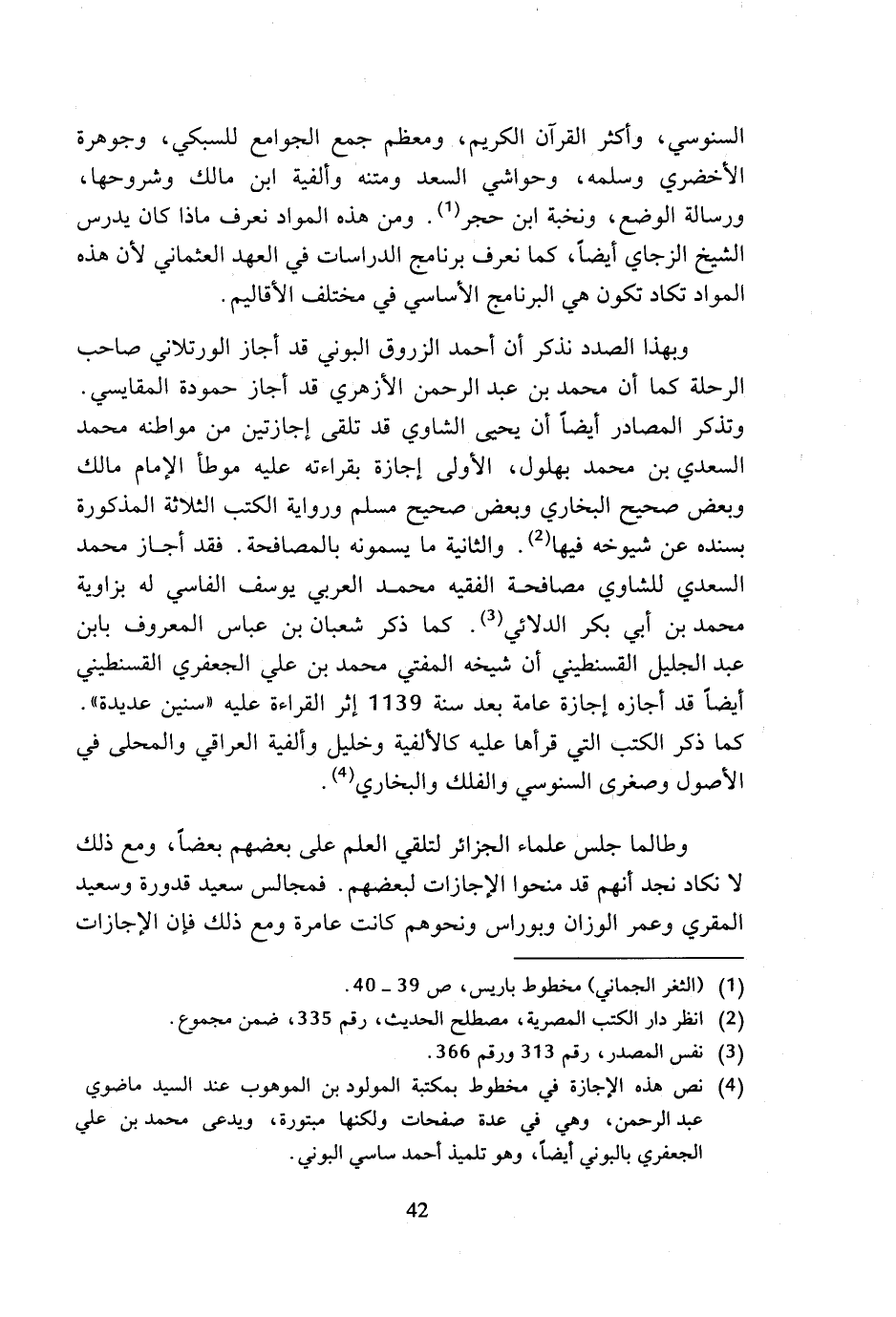 وبهذا الصدد نذكر أن أحمد الزروق البوني قد أجاز الورتلاني صاحب الرحلة كما أن محمد بن عبد الرحمن الأزهري قد أجاز حمودة المقايسي. وتذكر المصادر أيضا أن يحيى الشاوي قد تلقى إجازتين من مواطنه محمد السعدي بن محمد بهلول، الأولى إجازة بقراءته عليه موطأ الإمام مالك وبعض صحيح البخاري وبعض صحيح مسلم ورواية الكتب الثلاثة المذكورة بسنده عن شيوخه فيها (¬2). والثانية ما يسمونه بالمصافحة. فقد أجاز محمد السعدي للشاوي مصافحة الفقيه محمد العربي يوسف الفاسي له بزاوية محمد بن أبي بكر الدلائي (¬3). كما ذكر شعبان بن عباس المعروف بابن عبد الجليل القسنطيني أن شيخه المفتي محمد بن علي الجعفري القسنطيني أيضا قد أجازه إجازة عامة بعد سنة 1139 إثر القراءة عليه (سنين عديدة). كما ذكر الكتب التي قرأها عليه كالألفية وخليل وألفية العراقي والمحلى في الأصول وصغرى السنوسي والفلك والبخاري (¬4).