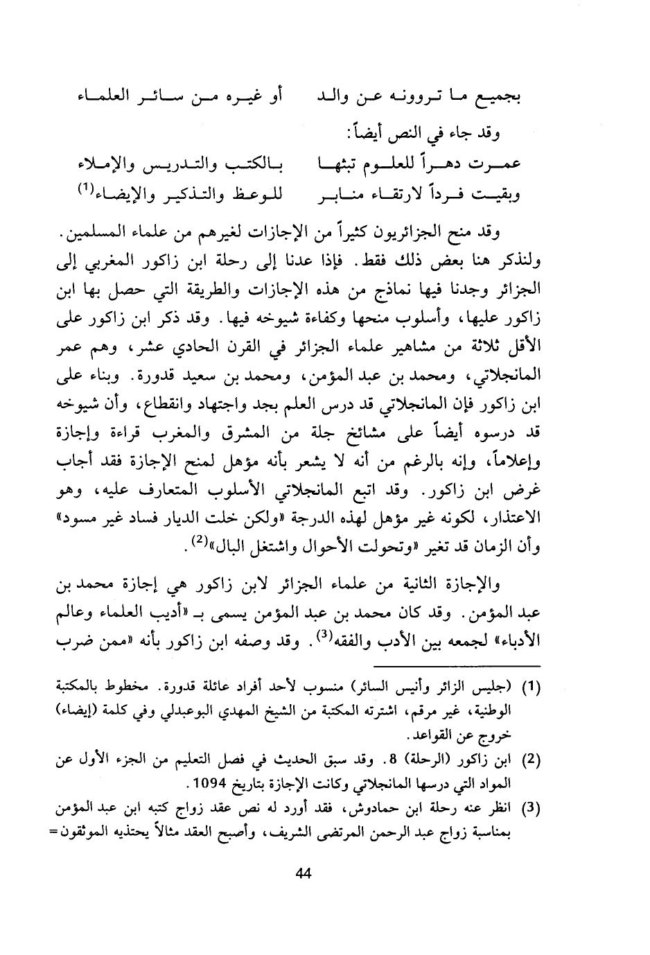 عمرت دهرا للعلوم تبثها ... بالكتب والتدريس والإملاء وبقيت فردا لارتقاء منابر ... للوعظ والتذكير والإيضاء (¬1) وقد منح الجزائريون كثيرا من الإجازات لغيرهم من علماء المسلمين. ولنذكر هنا بعض ذلك فقط. فإذا عدنا إلى رحلة ابن زاكور المغربي إلى الجزائر وجدنا فيها نماذج من هذه الإجازات والطريقة التي حصل بها ابن زاكور عليها، وأسلوب منحها وكفاءة شيوخه فيها. وقد ذكر ابن زاكور على الأقل ثلاثة من مشاهير علماء الجزائر في القرن الحادي عشر، وهم عمر المانجلاتي، ومحمد بن عبد المؤمن، ومحمد بن سعيد قدورة. وبناء على ابن زاكور فإن المانجلاتي قد درس العلم بجد واجتهاد وانقطاع، وأن شيوخه قد درسوه أيضا على مشائخ جلة من المشرق والمغرب قراءة وإجازة وإعلاما، وإنه بالرغم من أنه لا يشعر بأنه مؤهل لمنح الإجازة فقد أجاب غرض ابن زاكور. وقد اتبع المانجلاتي الأسلوب المتعارف عليه، وهو الاعتذار، لكونه غير مؤهل لهذه الدرجة (ولكن خلت الديار فساد غير مسود) وأن الزمان قد تغير (وتحولت الأحوال واشتغل البال) (¬2).