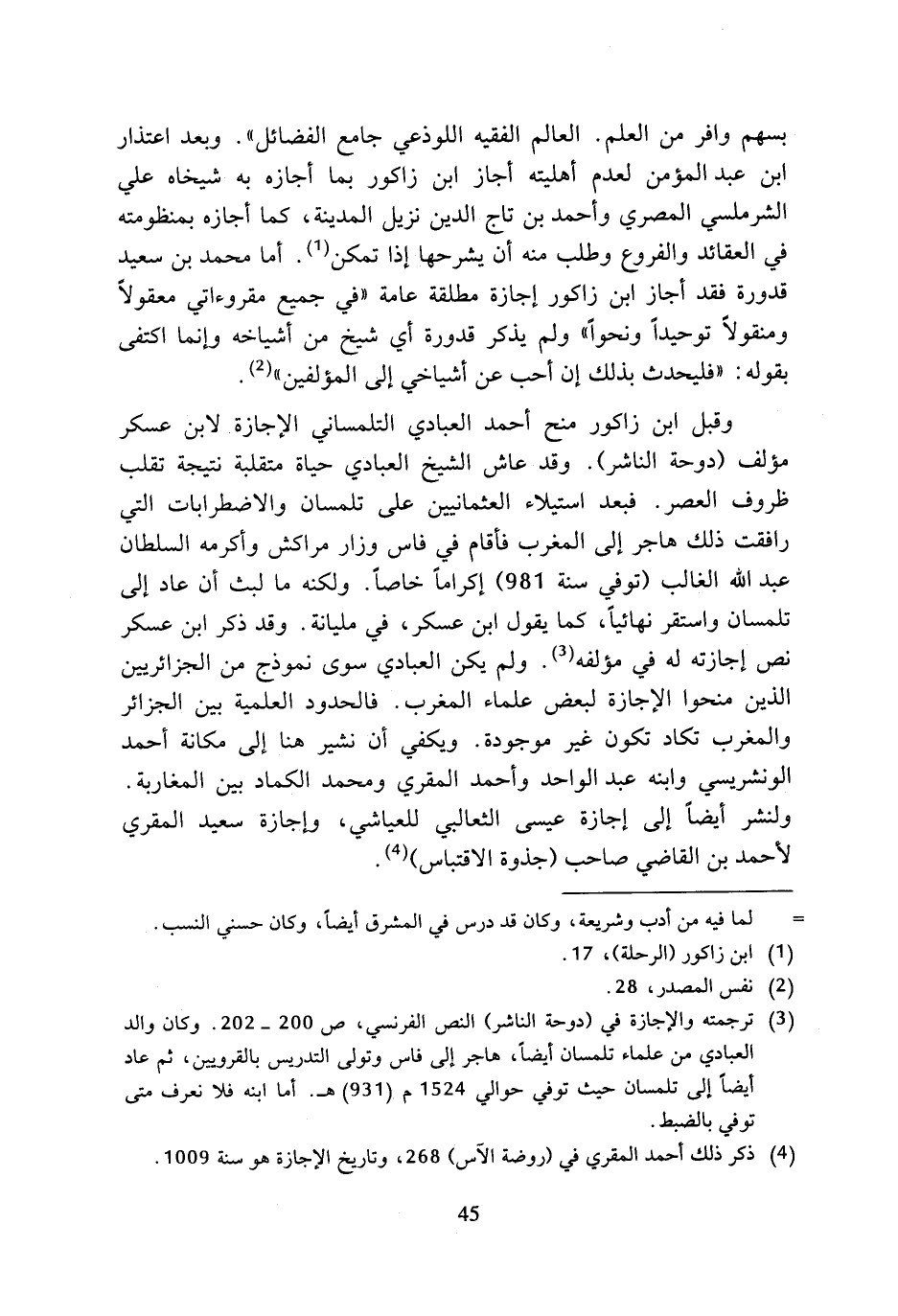 وقبل ابن زاكور منح أحمد العبادي التلمساني الإجازة لابن عسكر مؤلف (دوحة الناشر). وقد عاش الشيخ العبادي حياة متقلبة نتيجة تقلب ظروف العصر. فبعد استيلاء العثمانيين على تلمسان والاضطرابات التي رافقت ذلك هاجر إلى المغرب فأقام في فاس وزار مراكش وأكرمه السلطان عبد الله الغالب (توفي سنة 981) إكراما خاصا. ولكنه ما لبث أن عاد إلى تلمسان واستقر نهائيا، كما يقول ابن عسكر، في مليانة. وقد ذكر ابن عسكر نص إجازته له في مؤلفه (¬3). ولم يكن العبادي سوى نموذج من الجزائريين الذين منحوا الإجازة لبعض علماء المغرب. فالحدود العلمية بين الجزائر والمغرب تكاد تكون غير موجودة. ويكفي أن نشير هنا إلى مكانة أحمد الونشريسي وابنه عبد الواحد وأحمد المقري ومحمد الكماد بين المغاربة. ولنشر أيضا إلى إجازة عيسى الثعالبي للعياشي، وإجازة سعيد المقري لأحمد بن القاضي صاحب (جذوة الاقتباس) (¬4).
