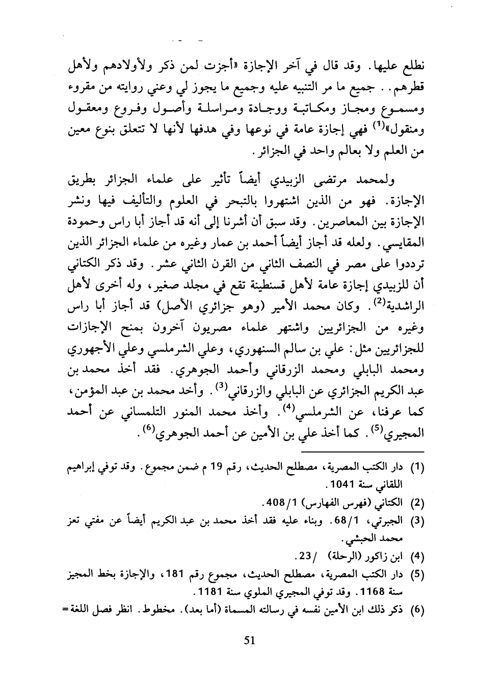 ولمحمد مرتضى الزبيدي أيضا تأثير على علماء الجزائر بطريق الإجازة. فهو من الذين اشتهروا بالتبحر في العلوم والتأليف فيها ونشر الإجازة بين المعاصرين. وقد سبق أن أشرنا إلى أنه قد أجاز أبا راس وحمودة المقايسي. ولعله قد أجاز أيضا أحمد بن عمار وغيره من علماء الجزائر الذين ترددوا على مصر في النصف الثاني من القرن الثاني عشر. وقد ذكر الكتاني أن للزبيدي إجازة عامة لأهل قسنطينة تقع في مجلد صغير، وله أخرى لأهل الراشدية (¬2). وكان محمد الأمير (وهو جزائري الأصل) قد أجاز أبا راس وغيره من الجزاريين واشتهر علماء مصريون آخرون بمنح الإجازات للجزائريين مثل: علي بن سالم السنهوري، وعلي الشرملسي وعلي الأجهوري ومحمد البابلي ومحمد الزرقاني وأحمد الجوهري. فقد أخذ محمد بن عبد الكريم الجزائري عن البابلي والزرقاني (¬3). وأخد محمد بن عبد المؤمن، كما عرفنا، عن الشرملسي (¬4). وأخذ محمد المنور التلمساني عن أحمد المجيري (¬5). كما أخذ علي بن الأمين عن أحمد الجوهري (¬6).