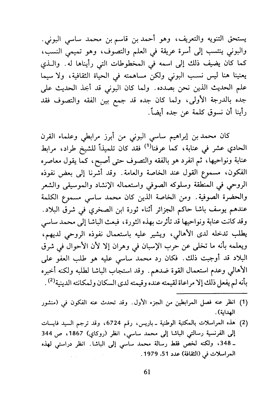 (¬2) هذه المراسلات بالمكتبة الوطنية - باريس، رقم 6724، وقد ترجم السيد فايسات إلى الفرنسية رسالتي الباشا إلى محمد ساسي، انظر (روكاي) 1867، ص 344 - 348، ولكنه لخص فقط رسالة محمد ساسي إلى الباشا. انظر دراستي لهذه المراسلات في (الثقافة) عدد 51، 1979.