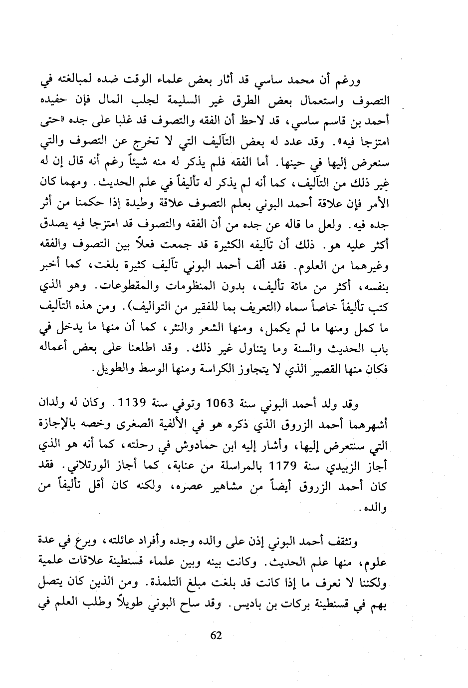 ورغم أن محمد ساسي قد أثار بعض علماء الوقت ضده لمبالغته في التصوف واستعمال بعض الطرق غير السليمة لجلب المال فإن حفيده أحمد بن قاسم ساسي، قد لاحظ أن الفقه والتصوف قد غلبا على جده (حتى امتزجا فيه). وقد عدد له بعض التآليف التي لا تخرج عن التصوف والتي سنعرض إليها في حينها. أما الفقه فلم يذكر له منه شيئا رغم أنه قال إن له غير ذلك من التآليف، كما أنه لم يذكر له تأليفا في علم الحديث. ومهما كان الأمر فإن علاقة أحمد البوني بعلم التصوف علاقة وطيدة إذا حكمنا من أثر جده فيه. ولعل ما قاله عن جده من أن الفقه والتصوف قد امتزجا فيه يصدق أكثر عليه هو. ذلك أن تآليفه الكثيرة قد جمعت فعلا بين التصوف والفقه وغيرهما من العلوم. فقد ألف أحمد البوني تآليف كثيرة بلغت، كما أخبر بنفسه، أكثر من مائة تأليف، بدون المنظومات والمقطوعات. وهو الذي كتب تأليفا خاصا سماه (التعريف بما للفقير من التواليف.). ومن هذه التآليف ما كمل ومنها ما لم يكمل، ومنها الشعر والنثر، كما أن منها ما يدخل في باب الحديث والسنة وما يتناول غير ذلك. وقد اطلعنا على بعض أعماله فكان منها القصير الذي لا يتجاوز الكراسة ومنها الوسط والطويل.