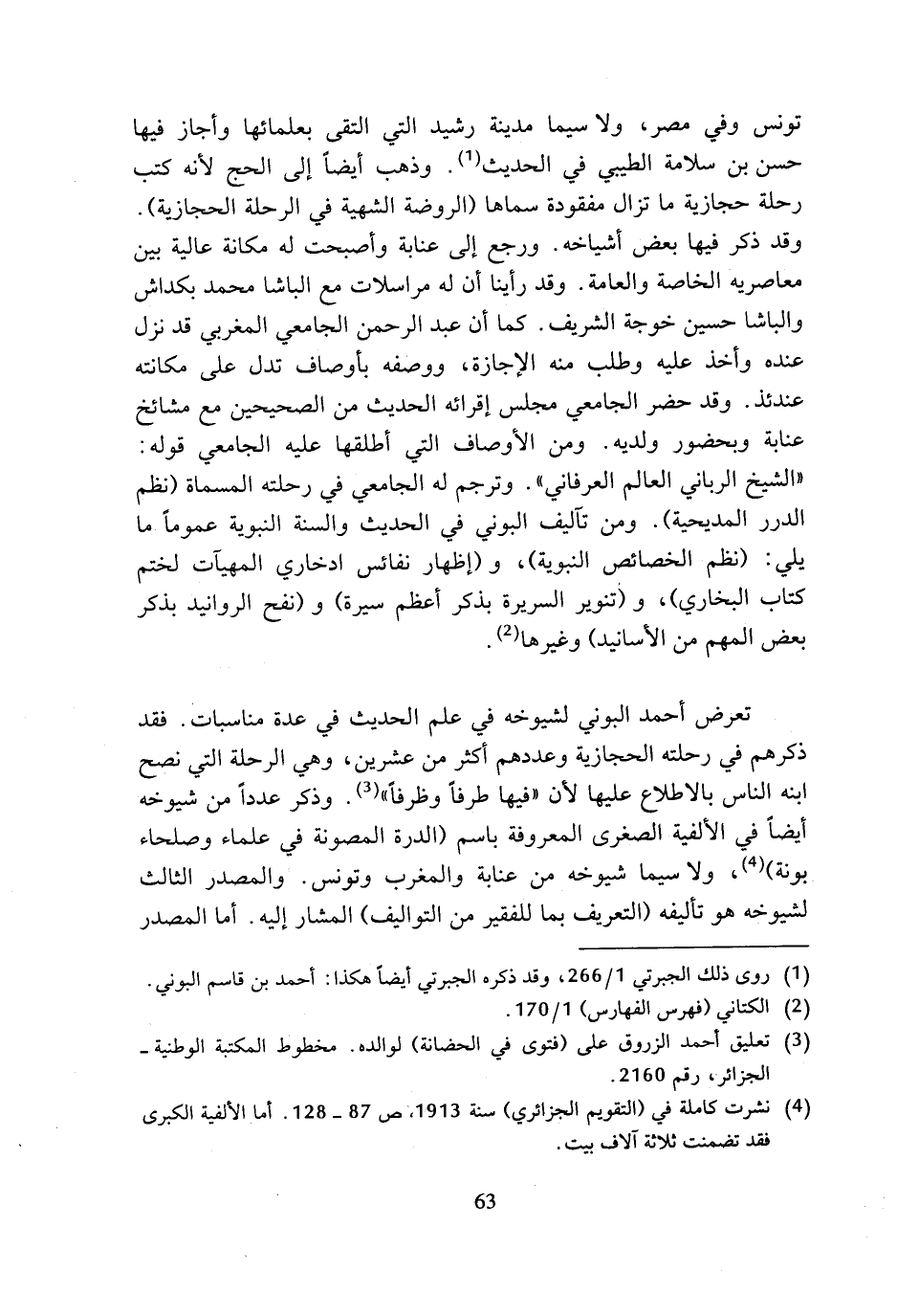 تونس وفي مصر، ولا سيما مدينة رشيد التي التقى بعلمائها وأجاز فيها حسن بن سلامة الطيبي في الحديث (¬1). وذهب أيضا إلى الحج لأنه كتب رحلة حجازية ما تزال مفقودة سماها (الروضة الشهية في الرحلة الحجازية). وقد ذكر فيها بعض أشياخه. ورجع إلى عنابة وأصبحت له مكانة عالية بين معاصريه الخاصة والعامة. وقد رأينا أن له مراسلات مع الباشا محمد بكداش والباشا حسين خوجة الشريف. كما أن عبد الرحمن الجامعي المغربي قد نزل عنده وأخذ عليه وطلب منه الإجازة، ووصفه بأوصاف تدل على مكانته عندئذ. وقد حضر الجامعي مجلس إقرائه الحديث من الصحيحين مع مشائخ عنابة وبحضور ولديه. ومن الأوصاف التي أطلقها عليه الجامعي قوله: (الشيخ الرباني العالم العرفاني). وترجم له الجامعي في رحلته المسماة (نظم الدرر المديحية). ومن تآليف البوني في الحديث والسنة النبوية عموما ما يلي: (نظم الخصائص النبوية)، و (إظهار نفائس ادخاري المهيآت لختم كتاب البخاري)، و (تنوير السريرة بذكر أعظم سيرة) و (نفح الروانيد بذكر بعض المهم من الأسانيد) وغيرها (¬2).