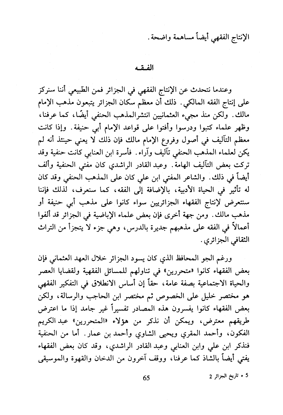 وعندما نتحدث عن الإنتاج الفقهي في الجزائر فمن الطبيعي أننا سنركز على إنتاج الفقه المالكي. ذلك أن معظم سكان الجزائر يتبعون مذهب الإمام مالك. ولكن منذ مجيء العثمانيين انتشر المذهب الحنفي أيضا، كما عرفنا، وظهر علماء كتبوا ودرسوا وأفتوا على قواعد الإمام أبي حنيفة. وإذا كانت معظم التآليف في أصول وفروع الإمام مالك فإن ذلك لا يعني حينئذ أنه لم يكن لعلماء المذهب الحنفي تآليف وآراء. فأسرة ابن العنابي كانت حنفية وقد تركت بعض التآليف الهامة. وعبد القادر الراشدي كان مفتي الحنفية وألف أيضا في ذلك. والشاعر المفتي ابن علي كان على المذهب الحنفي وقد كان له تأثير في الحياة الأدبية، بالإضافة إلى الفقه، كما سنعرف، لذلك فإننا سنتعرض لإنتاج الفقهاء الجزائريين سواء كانوا على مذهب أبي حنيفة أو مذهب مالك. ومن جهة أخرى فإن بعض علماء الإباضية في الجزائر قد ألفوا أعمالا في الفقه على مذهبهم جديرة بالدرس، وهي جزء لا يتجزأ من التراث الثقافي الجزائري.