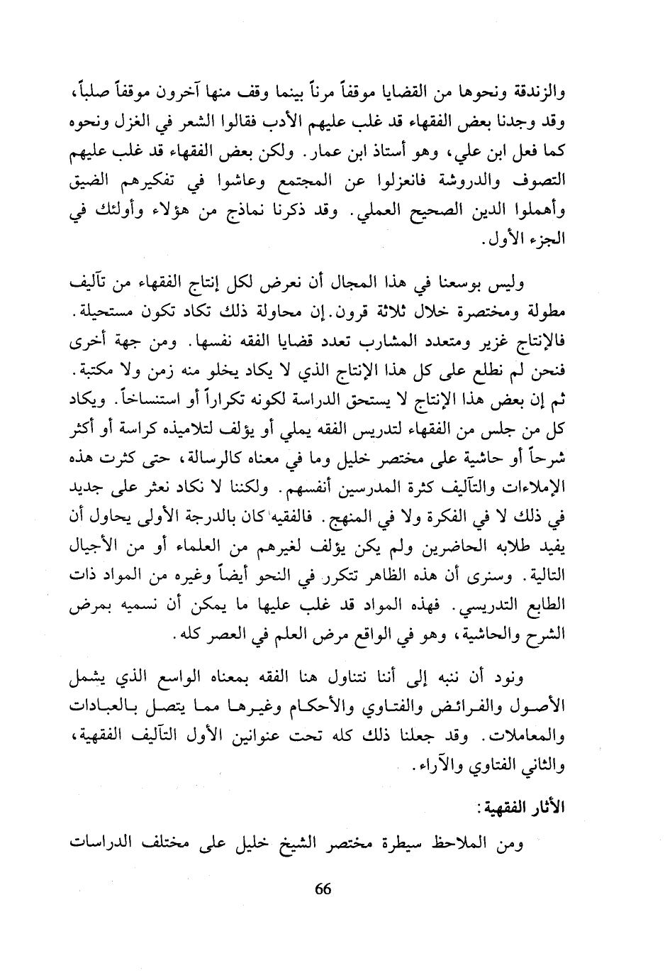 ونود أن ننبه إلى أننا نتناول هنا الفقه بمعناه الواسع الذي يشمل الأصول والفرائض والفتاوى والأحكام وغيرها مما يتصل بالعبادات والمعاملات. وقد جعلنا ذلك كله تحت عنوانين الأول التآليف الفقهية، والثاني الفتاوى والآراء.