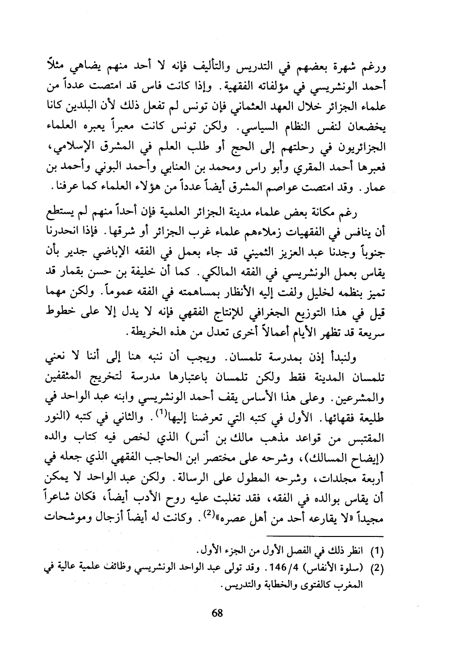ولنبدأ إذن بمدرسة تلمسان. ويجب أن ننبه هنا إلى أننا لا نعني تلمسان المدينة فقط ولكن تلمسان باعتبارها مدرسة لتخريج المثقفين والمشرعين. وعلى هذا الأساس يقف أحمد الونشريسي وابنه عبد الواحد في طليعة فقهائها. الأول في كتبه التي تعرضنا إليها (¬1). والثاني في كتبه (النور المقتبس من قواعد مذهب مالك بن أنس) الذي لخص فيه كتاب والده (إيضاح السالك)، وشرحه على مختصر ابن الحاجب الفقهي الذي جعله في أربعة مجلدات، وشرحه المطول على الرسالة. ولكن عبد الواحد لا يمكن أن يقاس بوالده في الفقه، فقد تغلبت عليه روح الأدب أيضا، فكان شاعرا مجيدا (لا يقارعه أحد من أهل عصره) (¬2). وكانت له أيضا أزجال وموشحات