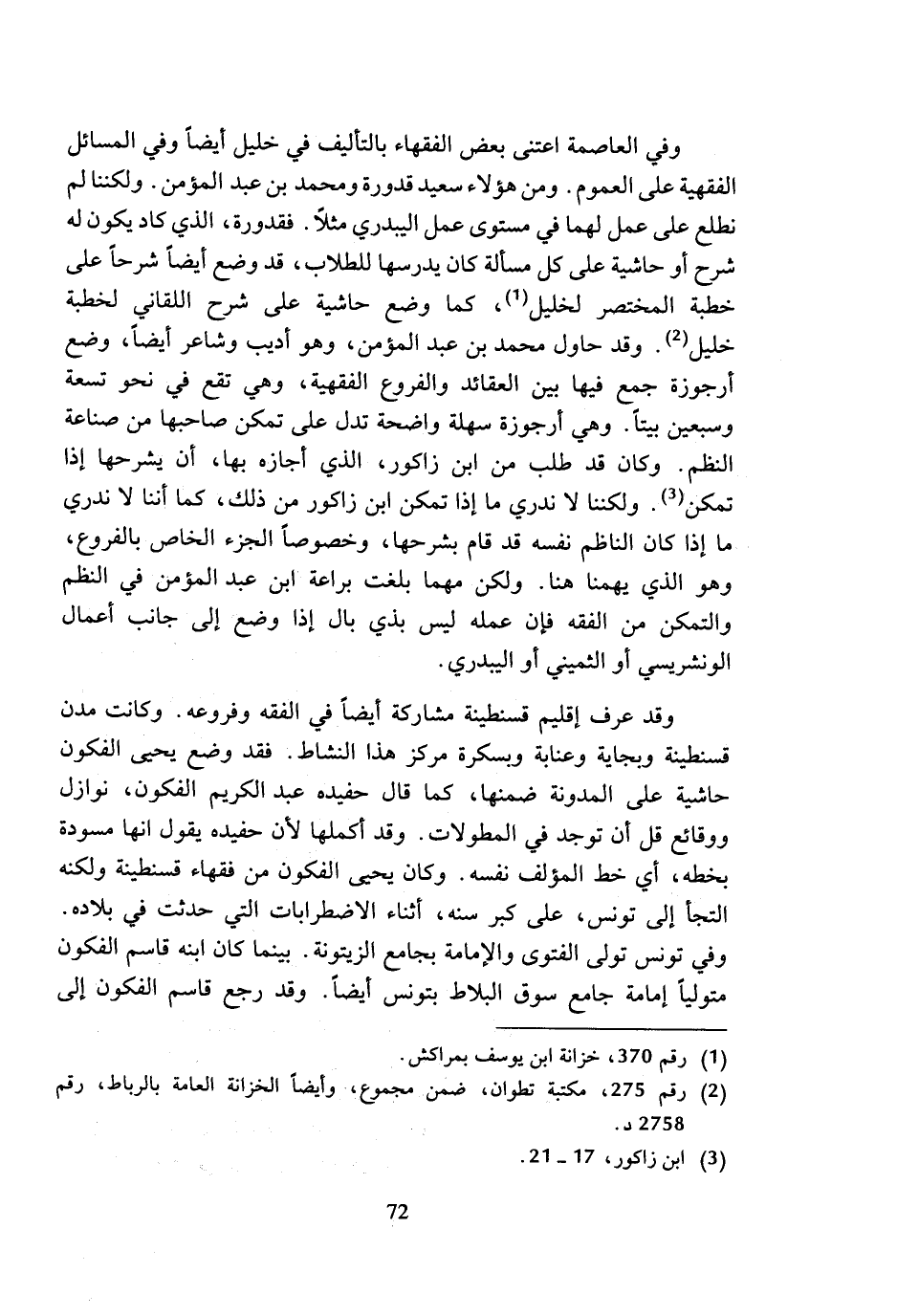 وفي العاصمة اعتنى بعض الفقهاء بالتأليف في خليل أيضا وفي المسائل الفقهية على العموم. ومن هؤلاء سعيد قدورة ومحمد بن عبد المؤمن. ولكننا لم نطلع على عمل لهما في مستوى عمل اليبدري مثلا. فقدورة، الذي كاد يكون له شرح أو حاشية على كل مسألة كان يدرسها للطلاب، قد وضع أيضا شرحا على خطبة المختصر لخليل (¬1)، كما وضع حاشية على شرح اللقاني لخطبة خليل (¬2). وقد حاول محمد بن عبد المؤمن، وهو أديب وشاعر أيضا، وضع أرجوزة جمع فيها بين العقائد والفروع الفقهية، وهي تقع في نحو تسعة وسبعين بيتا. وهي أرجوزة سهلة واضحة تدل على تمكن صاحبها من صناعة النظم. وكان قد طلب من ابن زاكور، الذي أجازه بها، أن يشرحها إذا تمكن (¬3). ولكننا لا ندري ما إذا تمكن ابن زاكور من ذلك، كما أننا لا ندري ما إذا كان الناظم نفسه قد قام بشرحها، وخصوصا الجزء الخاص بالفروع، وهو الذي يهمنا هنا. ولكن مهما بلغت براعة ابن عبد المؤمن في النظم والتمكن من الفقه فإن عمله ليس بذي بال إذا وضع إلى جانب أعمال الونشريسي أو الثميني أو اليبدري.