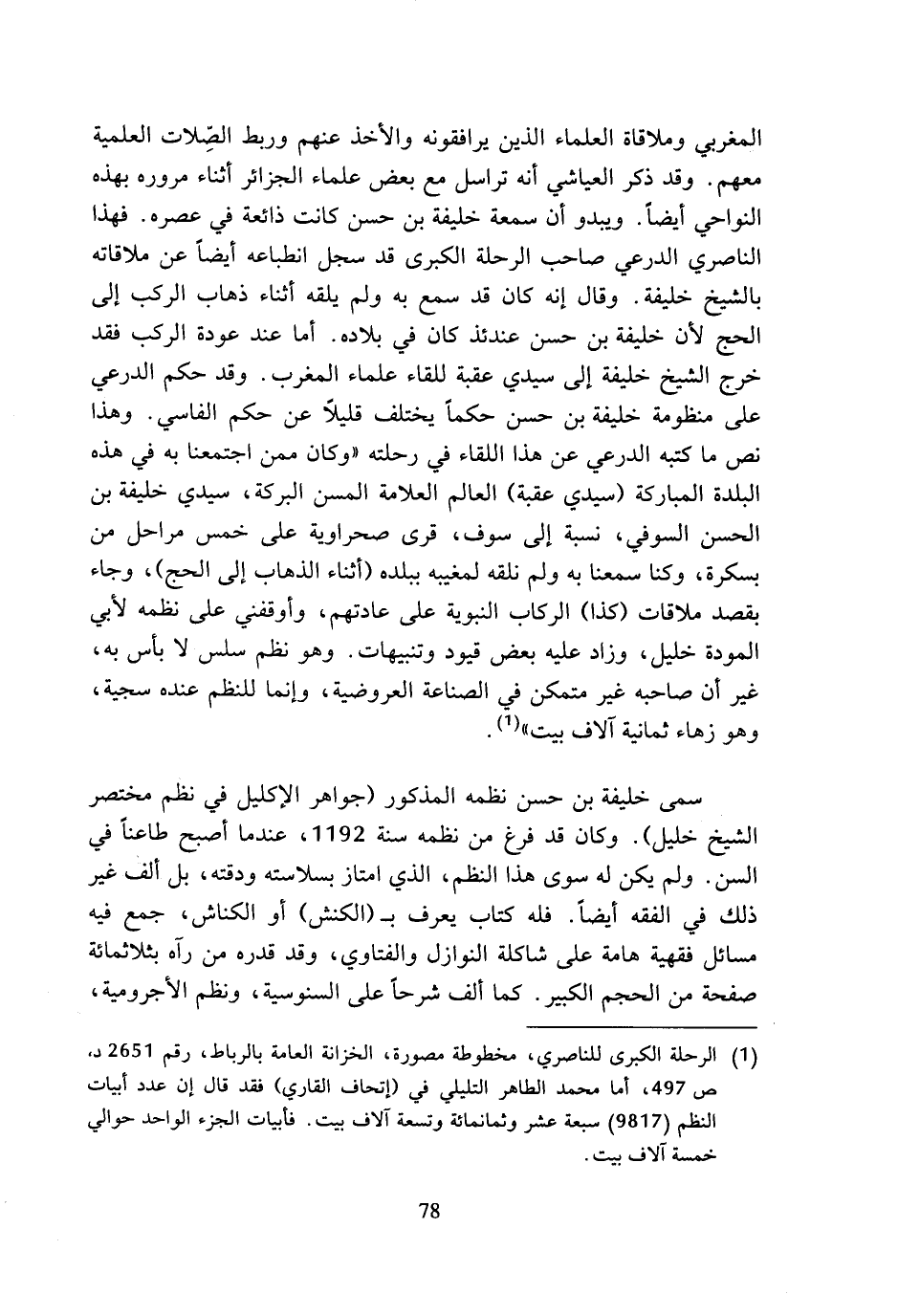 (¬1) الرحلة الكبرى للناصري، مخطوطة مصورة، الخزانة العامة بالرباط، رقم 2651 د، ص 497، أما محمد الطاهر التليلي في (إتحاف القاري) فقد قال إن عدد أبيات النظم (9817) سبعة عشر وثمانمائة وتسعة آلاف بيت. فأبيات الجزء الواحد حوالي خمسة آلاف بيت.