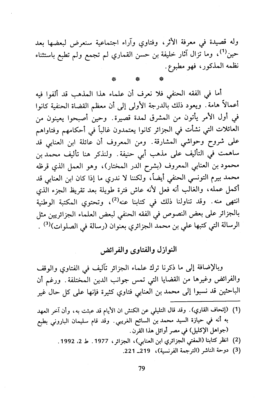 أما في الفقه الحنفي فلا نعرف أن علماء هذا المذهب قد ألفوا فيه أعمالا هامة. ويعود ذلك بالدرجة الأولى إلى أن معظم القضاة الحنفية كانوا في أول الأمر يأتون من المشرق لمدة قصيرة. وحين أصبحوا يعينون من العائلات التي نشأت في الجزائر كانوا يعتمدون غالبا في أحكامهم وفتاواهم على شروح وحواشي المشارقة. ومن المعروف أن عائلة ابن العنابي قد ساهمت في التأليف على مذهب أبي حنيفة. ولنذكر هنا تأليف محمد بن محمود بن العنابي المعروف (بشرح الدر المختار)، وهو العمل الذي قرظه محمد بيرم التونسي الحنفي أيضا، ولكننا لا ندري ما إذا كان ابن العنابي قد أكمل عمله، والغالب أنه فعل لأنه عاش فترة طويلة بعد تقريظ الجزء الذي انتهى منه. وقد تناولنا ذلك في كتابنا عنه (¬2)، وتحتوي المكتبة الوطنية بالجزائر على بعض النصوص في الفقه الحنفي لبعض العلماء الجزائريين مثل الرسالة التي كتبها علي بن محمد الجزائري بعنوان (رسالة في الصلوات) (¬3).