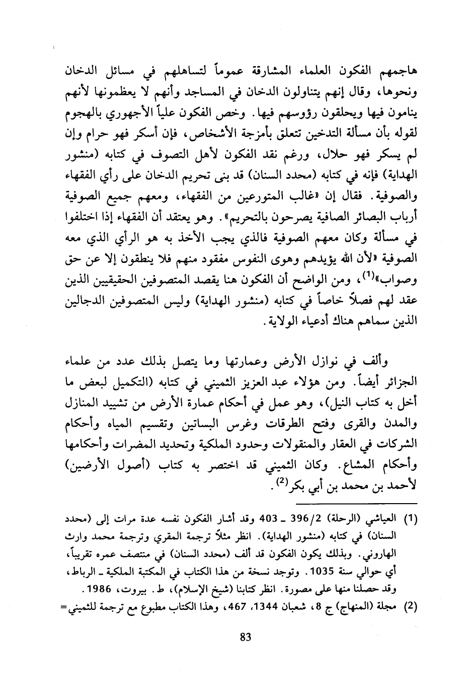 (¬1) العياشي (الرحلة) 2/ 396 - 403 وقد أشار الفكون نفسه عدة مرات إلى (محدد السنان) في كتابه (منشور الهداية). انظر مثلا ترجمة المقري وترجمة محمد وارث الهاروني. وبذلك يكون الفكون قد ألف (محدد السنان) في منتصف عمره تقريبا، أي حوالي سنة 1035. وتوجد نسخة من هذا الكتاب في المكتبة الملكية - الرباط، وقد حصلنا منها على مصورة. انظر كتابنا (شيخ الإسلام)، ط. بيروت، 1906.