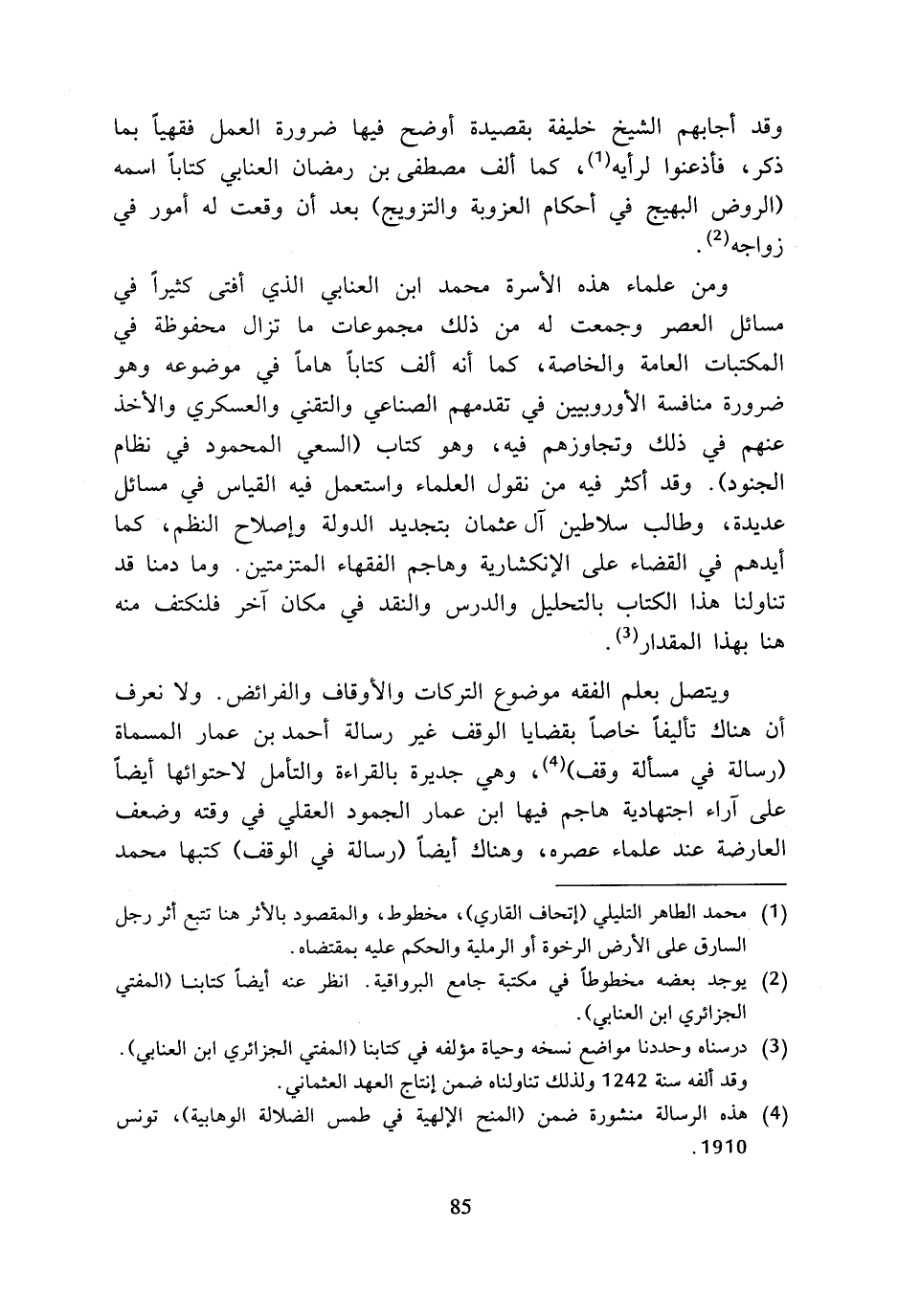 ومن علماء هذه الأسرة محمد ابن العنابي الذي أفتى كثيرا في مسائل العصر وجمعت له من ذلك مجموعات ما تزال محفوظة في المكتبات العامة والخاصة، كما أنه ألف كتابا هاما في موضوعه وهو ضرورة منافسة الأوروبيين في تقدمهم الصناعي والتقني والعسكري والأخذ عنهم في ذلك وتجاوزهم فيه، وهو كتاب (السعي المحمود في نظام الجنود). وقد أكثر فيه من نقول العلماء واستعمل فيه القياس في مسائل عديدة، وطالب سلاطين آل عثمان بتجديد الدولة وإصلاح النظم، كما أيدهم في القضاء على الإنكشارية وهاجم الفقهاء المتزمتين. وما دمنا قد تناولنا هذا الكتاب بالتحليل والدرس والنقد في مكان آخر فلنكتف منه هنا بهذا المقدار (¬3).