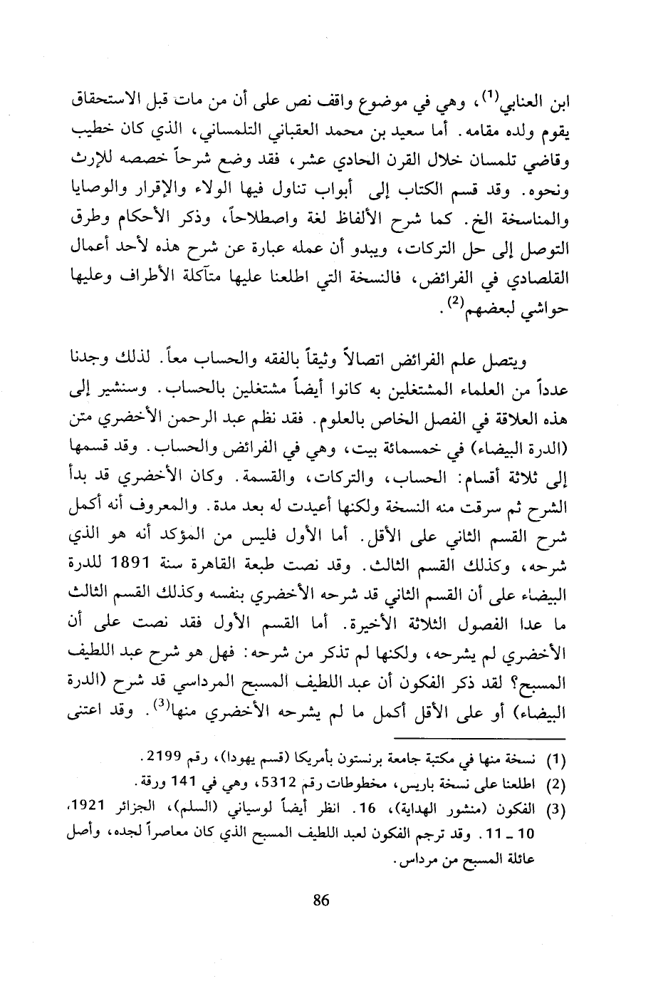 ابن العنابي (¬1)، وهي في موضوع واقف نص على أن من مات قبل الاستحقاق يقوم ولده مقامه. أما سعيد بن محمد العقباني التلمساني، الذي كان خطيب وقاضي تلمسان خلال القرن الحادي عشر، فقد وضع شرحا خصصه للإرث ونحوه. وقد قسم الكتاب إلى أبواب تناول فيها الولاء والإقرار والوصايا والمناسخة الخ. كما شرح الألفاظ لغة واصطلاحا، وذكر الأحكام وطرق التوصل إلى حل التركات، ويبدو أن عمله عبارة عن شرح هذه لأحد أعمال القلصادي في الفرائض، فالنسخة التي اطلعنا عليها متآكلة الأطراف وعليها حواشي لبعضهم (¬2).