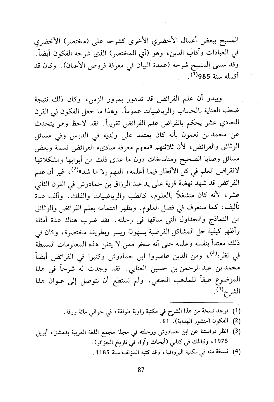 ويبدو أن علم الفرائض قد تدهور بمرور الزمن، وكان ذلك نتيجة ضعف العناية بالحساب والرياصيات عموما. وهذا ما جعل الفكون في القرن الحادي عشر يحكم بانقراض علم الفرائض تقريبا. فقد لاحظ وهو يتحدث عن محمد بن نعمون بأنه كان يعتمد على ولديه في الدرس وفي مسائل الوثائق والفرائض، لأن ثلاثتهم (معهم معرفة مبادئ الفرائض قسمة وبعض مسائل وصايا الصحيح ومناسخات دون ما عدى ذلك من أبوابها ومشكلاتها لانقراض العلم في كل الأقطار فيما أعلمه، اللهم إلا ما شذ) (¬2)، غير أن علم الفرائض قد شهد نهضة قوية على يد عبد الرزاق بن حمادوش في القرن الثاني عشر، لأنه كان منشغلا بالعلوم، كالطب والرياضيات والفلك، وألف عدة تآليف، كما سنعرف في فصل العلوم. ويظهر اهتمامه بعلم الفرائض والوثائق من النماذج والجداول التي ساقها في رحلته. فقد ضرب هناك عدة أمثلة وأظهر كيفية حل المشاكل الفرضية بسهولة ويسر وبطريقة مختصرة، وكان في ذلك معتدا بنفسه وعلمه حتى أنه سخر ممن لا يتقن هذه المعلومات البسيطة في نظره (¬3)، ومن الذين عاصروا ابن حمادوش وكتبوا في الفرائض أيضا محمد بن عبد الرحمن بن حسين العنابي. فقد وجدت له شرحا في هذا الموضوع طبقا للمذهب الحنفي، ولم نستطع أن نتوصل إلى عنوان هذا الشرح (¬4).