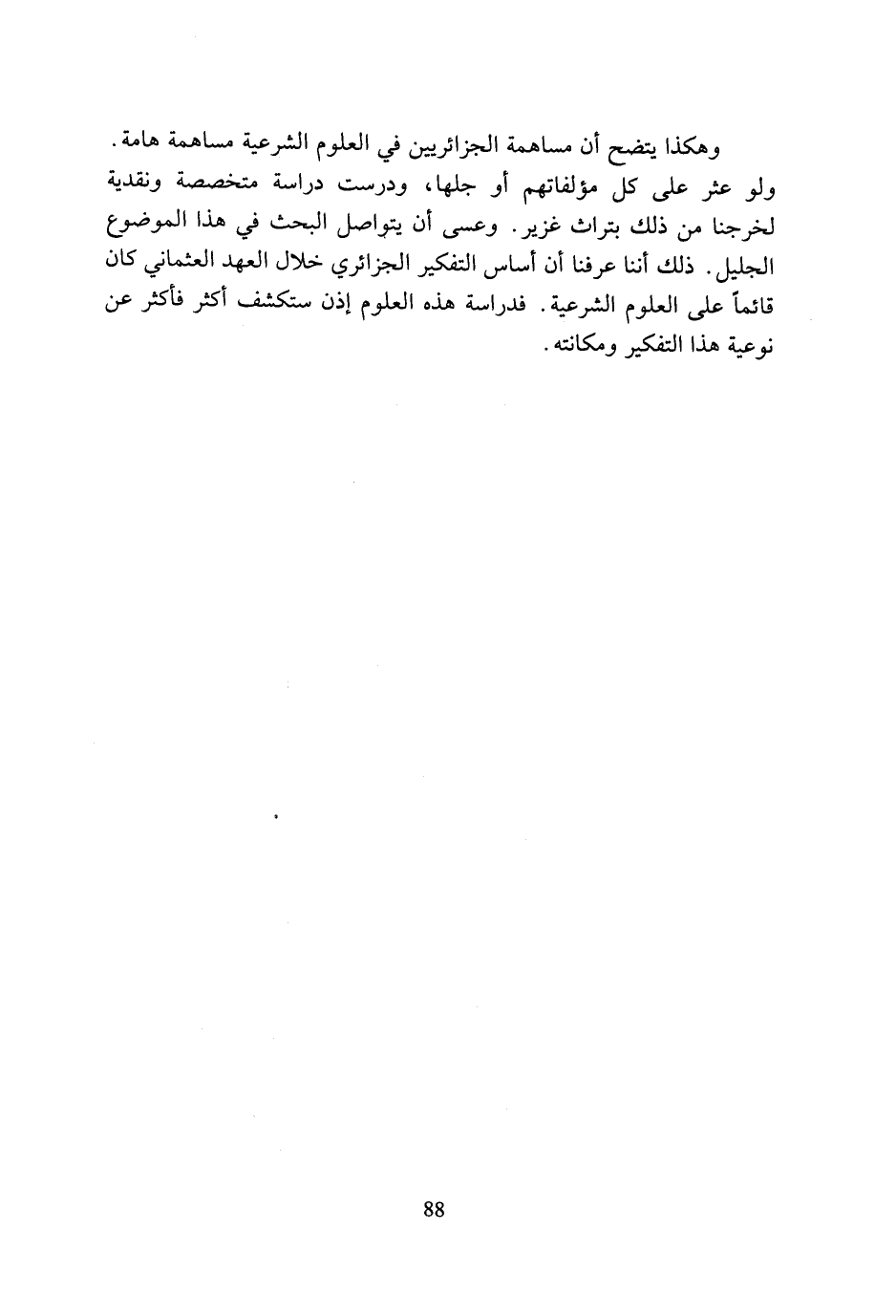 ولو عثر على كل مؤلفاتهم أو جلها، ودرست دراسة متخصصة ونقدية لخرجنا من ذلك بتراث غزير. وعسى أن يتواصل البحث في هذا الموضوع الجليل. ذلك أننا عرفنا أن أساس التفكير الجزائري خلال العهد العثماني كان قائما على العلوم الشرعية. فدراسة هذه العلوم إذن ستكشف أكثر فأكثر عن نوعية هذا التفكير ومكانته.