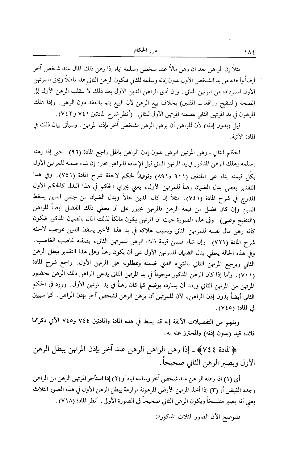 رَاجِعْ شَرْحَ الْمَادَّةِ (1 0 7) . وَأَمَّا إذَا كَانَ الرَّهْنُ الْمَذْكُورُ مَوْجُودًا فِي يَدِ الْمُرْتَهِنِ الثَّانِي يَدَّعِي الرَّاهِنُ ذَلِكَ الرَّهْنَ بِحُضُورِ الْمُرْتَهِنِ مِنْ الْمُرْتَهِنِ الثَّانِي وَبَعْدَ أَنْ يَسْتَرِدَّهُ يُوضَعُ كَمَا كَانَ رَهْنًا فِي يَدِ الْمُرْتَهِنِ الْأَوَّلِ. وَوَرَدَ فِي الْحُكْمِ الثَّانِي أَيْضًا بِدُونِ إذْنِ الرَّاهِنِ؛ لِأَنَّ لِلْمُرْتَهِنِ أَنْ يَرْهَنَ الرَّهْنَ لِشَخْصٍ آخَرَ بِإِذْنِ الرَّاهِنِ. كَمَا سَيَبِينُ فِي الْمَادَّةِ (745) وَيُفْهَمُ مِنْ التَّفْصِيلَاتِ الْآنِفَةِ أَنَّهُ قَدْ بُسِطَ فِي هَذِهِ الْمَادَّةِ وَالْمَادَّتَيْنِ 4 74 و 745 الْآتِي ذِكْرُهُمَا فَائِدَةُ قَيْدِ (بِدُونِ إذْنِهِ) وَالْمُحْتَرِزِ عَنْهُ بِهِ.