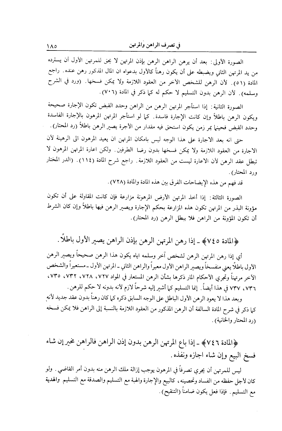 (الْمَادَّةُ 745) - إذَا رَهَنَ الْمُرْتَهِنُ الرَّهْنَ بِإِذْنِ الرَّاهِنِ يَصِيرُ الْأَوَّلُ بَاطِلًا. أَيْ إذَا رَهَنَ الْمُرْتَهِنُ الرَّهْنَ لِشَخْصٍ آخَرَ وَسَلَّمَهُ إيَّاهُ يَكُونُ هَذَا الرَّهْنُ صَحِيحًا وَيَصِيرُ الرَّهْنُ الْأَوَّلُ بَاطِلًا يَعْنِي مُنْفَسِخًا وَيَصِيرُ الرَّاهِنُ الْأَوَّلُ مُعِيرًا وَالرَّاهِنُ الثَّانِي - الْمُرْتَهِنُ الْأَوَّلُ - مُسْتَعِيرًا وَالشَّخْصُ الْآخَرُ مُرْتَهِنًا وَتُجْرَى الْأَحْكَامُ الْمَارُّ ذِكْرُهَا بِشَأْنِ الرَّهْنِ الْمُسْتَعَارِ فِي الْمَوَادِّ 727، 728، 732، 735، 736، 737 فِي هَذَا أَيْضًا. إنَّمَا التَّسْلِيمُ كَمَا أُشِيرَ إلَيْهِ شَرْحًا لَازِمٌ لِأَنَّهُ بِدُونِهِ لَا حُكْمَ لِلرَّهْنِ. وَبَعْدَ هَذَا لَا يَعُودُ الرَّهْنُ الْأَوَّلُ الْبَاطِلُ عَلَى الْوَجْهِ السَّابِقِ ذِكْرُهُ كَمَا كَانَ رَهْنًا بِدُونِ عَقْدٍ جَدِيدٍ لِأَنَّهُ كَمَا ذُكِرَ فِي شَرْحِ الْمَادَّةِ السَّالِفَةِ أَنَّ الرَّهْنَ الْمَذْكُورَ مِنْ الْعُقُودِ اللَّازِمَةِ بِالنِّسْبَةِ إلَى الرَّاهِنِ فَلَا يُمْكِنُ فَسْخُهُ (رَدُّ الْمُحْتَارِ وَالْخَانِيَّةُ)