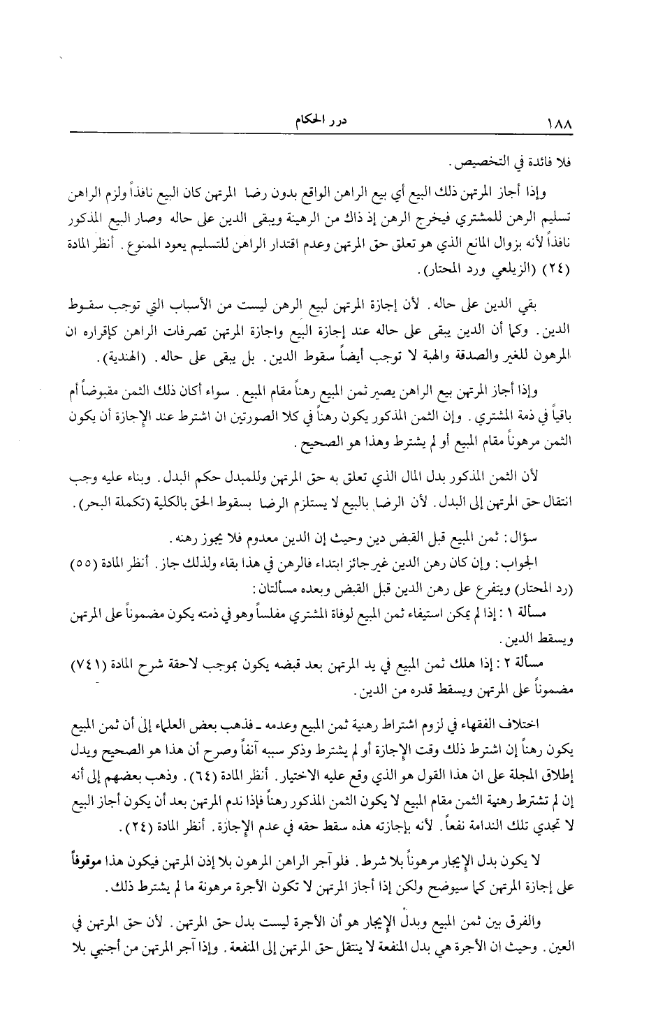 وَذَهَبَ بَعْضُهُمْ إلَى أَنَّهُ إنْ لَمْ تُشْتَرَطْ رَهْنِيَّةٌ الثَّمَنِ مَقَامَ الْمَبِيعِ لَا يَكُونُ الثَّمَنُ الْمَذْكُورُ رَهْنًا فَإِذَا نَدِمَ الْمُرْتَهِنُ بَعْدَ أَنْ يَكُونَ أَجَازَ الْبَيْعَ لَا تُجْدِي تِلْكَ النَّدَامَةُ نَفْعًا لِأَنَّهُ بِإِجَازَتِهِ هَذِهِ سَقَطَ حَقُّهُ فِي عَدَمِ الْإِجَازَةِ. اُنْظُرْ الْمَادَّةَ (24) . لَا يَكُونُ بَدَلُ الْإِيجَارِ مَرْهُونًا بِلَا شَرْطٍ. فَلَوْ آجَرَ الرَّاهِنُ الْمَرْهُونَ بِلَا إذْنِ الْمُرْتَهِنِ فَيَكُونُ هَذَا مَوْقُوفًا عَلَى إجَازَةِ الْمُرْتَهِنِ كَمَا سَيُوَضَّحُ وَلَكِنْ إذَا أَجَازَ الْمُرْتَهِنُ لَا تَكُونُ الْأُجْرَةُ مَرْهُونَةً مَا لَمْ يُشْتَرَطْ ذَلِكَ.