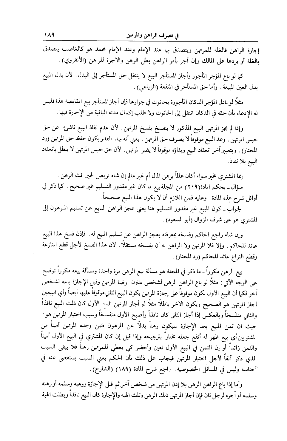 بَيْعُ الرَّهْنِ مُكَرَّرًا - مَا ذُكِرَ فِي الْمَجَلَّةِ هُوَ مَسْأَلَةُ بَيْعِ الرَّهْنِ مَرَّةً وَاحِدَةً وَمَسْأَلَةُ بَيْعِهِ مُكَرَّرًا تُوَضَّحُ عَلَى الْوَجْهِ الْآتِي: مَثَلًا لَوْ بَاعَ الرَّاهِنُ الرَّهْنَ لِشَخْصٍ بِدُونِ رِضَا الْمُرْتَهِنِ وَقَبْلَ الْإِجَازَةِ بَاعَهُ لِشَخْصٍ آخَرَ فَكَمَا أَنَّ الْبَيْعَ الْأَوَّلَ يَكُونُ مَوْقُوفًا عَلَى إجَازَةِ الْمُرْتَهِنِ يَكُونُ الْبَيْعُ الثَّانِي مَوْقُوفًا عَلَيْهَا أَيْضًا وَأَيَّ الْبَيْعَيْنِ أَجَازَ الْمُرْتَهِنُ هُوَ الصَّحِيحُ وَيَكُونُ الْآخَرُ بَاطِلًا مَثَلًا لَوْ أَجَازَ الْمُرْتَهِنُ الْبَيْعَ الْأَوَّلَ كَانَ ذَلِكَ الْبَيْعُ نَافِذًا وَالثَّانِي مُنْفَسِخًا وَبِالْعَكْسِ إذَا أَجَازَ الثَّانِي كَانَ نَافِذًا وَأَصْبَحَ الْأَوَّلُ مُنْفَسِخًا وَسَبَبُ اخْتِيَارِ الْمُرْتَهِنِ هُوَ: حَيْثُ إنَّ ثَمَنَ الْمَبِيعِ بَعْدَ الْإِجَازَةِ سَيَكُونُ رَهْنًا بَدَلًا عَنْ الْمَرْهُونِ فَمَنْ وَجَدَهُ الْمُرْتَهِنُ أَمِينًا مِنْ الْمُشْتَرِيَيْنِ أَيُّ بَيْعٍ ظَهَرَ لَهُ أَنْفَعَ جَعَلَهُ مُخْتَارًا بِتَرْجِيحِهِ وَإِذَا قِيلَ إنْ كَانَ الْمُشْتَرِي فِي الْبَيْعِ الْأَوَّلِ أَمِينًا وَالثَّمَنُ زَائِدًا أَوْ أَنَّ الثَّمَنَ فِي الْبَيْعِ الْأَوَّلِ تَعَيَّنَ وَأُحْضِرَ كَيْ يُعْطَى لِلْمُرْتَهِنِ رَهْنًا فَلَا يَبْقَى السَّبَبُ الَّذِي ذُكِرَ آنِفًا لِأَجْلِ اخْتِيَارِ الْمُرْتَهِنِ فَيُجَابُ عَلَى ذَلِكَ بِأَنَّ الْحُكْمَ يَعْنِي السَّبَبَ يُسْتَقْصَى عَنْهُ فِي أَجْنَاسِهِ وَلَيْسَ فِي الْمَسَائِلِ الْخُصُوصِيَّةِ رَاجِعْ شَرْحَ الْمَادَّةِ (189) (الشَّارِحُ) .