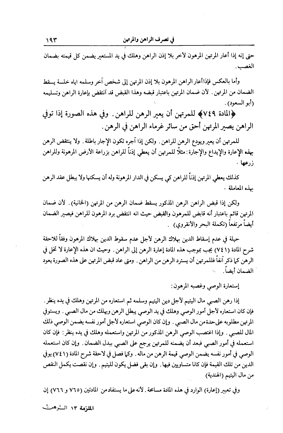[ (الْمَادَّةُ 749) لِلْمُرْتَهِنِ أَنْ يُعِيرَ الرَّهْنَ لِلرَّاهِنِ]