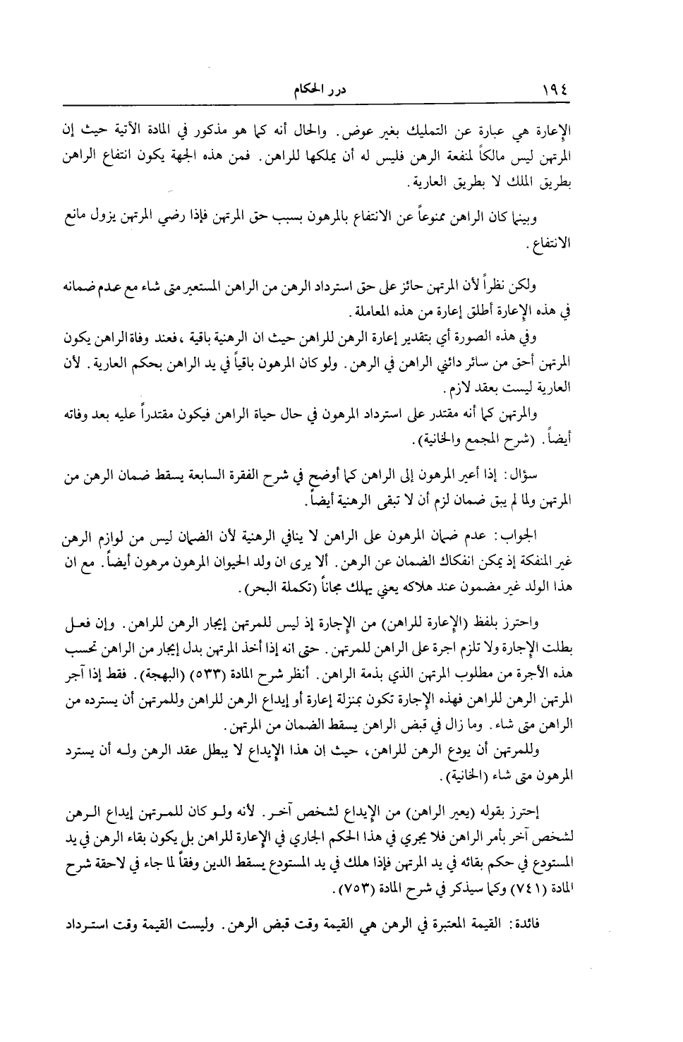 احْتَرَزَ بِقَوْلِهِ (يُعِيرُ الرَّاهِنَ) مِنْ الْإِيدَاعِ لِشَخْصٍ آخَرَ. لِأَنَّهُ وَلَوْ كَانَ لِلْمُرْتَهِنِ إيدَاعُ الرَّهْنِ لِشَخْصٍ آخَرَ بِأَمْرِ الرَّاهِنِ فَلَا يَجْرِي فِي هَذَا الْحُكْمِ الْجَارِي فِي الْإِعَارَةِ لِلرَّاهِنِ بَلْ يَكُونُ بَقَاءُ الرَّهْنِ فِي يَدِ الْمُسْتَوْدَعِ فِي حُكْمِ بَقَائِهِ فِي يَدِ الْمُرْتَهِنِ فَإِذَا هَلَكَ فِي يَدِ الْمُسْتَوْدَعِ يَسْقُطُ الدَّيْنُ وَفْقًا لِمَا جَاءَ فِي لَاحِقَةِ شَرْحِ الْمَادَّةِ (741) وَكَمَا سَيُذْكَرُ فِي شَرْحِ الْمَادَّةِ (753) فَائِدَةٌ: الْقِيمَةُ الْمُعْتَبَرَةُ فِي الرَّهْنِ هِيَ الْقِيمَةُ وَقْتَ قَبْضِ الرَّهْنِ. وَلَيْسَتْ الْقِيمَةَ وَقْتَ اسْتِرْدَادِ