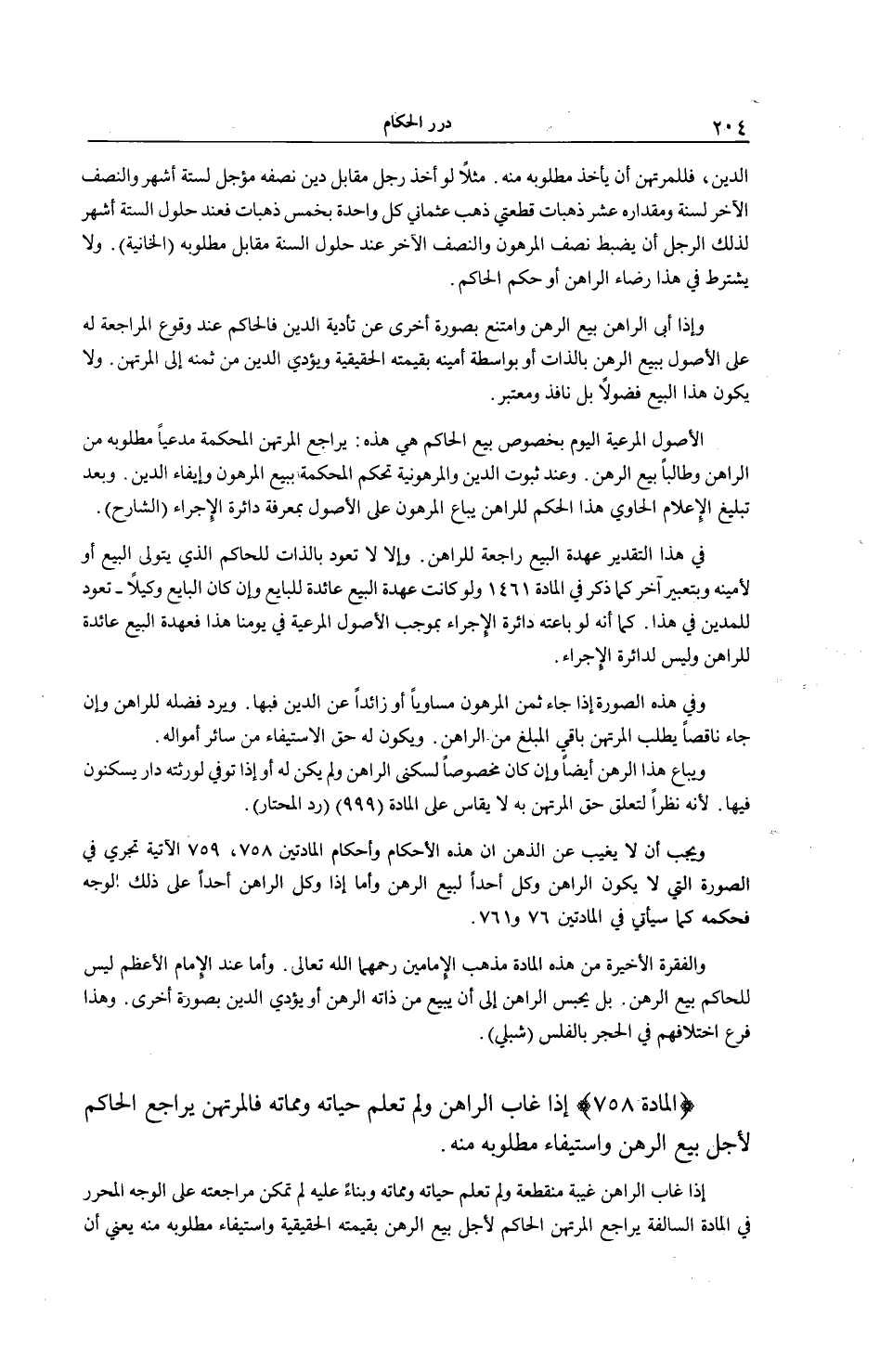 (الْمَادَّةُ 758) إذَا غَابَ الرَّاهِنُ وَلَمْ تُعْلَمْ حَيَاتُهُ وَمَمَاتُهُ فَالْمُرْتَهِنُ يُرَاجِعُ الْحَاكِمَ لِأَجْلِ بَيْعِ الرَّهْنِ وَاسْتِيفَاءِ مَطْلُوبِهِ مِنْهُ. إذَا غَابَ الرَّاهِنُ غِيبَةً مُنْقَطِعَةً وَلَمْ تُعْلَمْ حَيَاتُهُ وَمَمَاتُهُ وَبِنَاءً عَلَيْهِ لَمْ تُمْكِنْ مُرَاجَعَتُهُ عَلَى الْوَجْهِ الْمُحَرَّرِ فِي الْمَادَّةِ السَّالِفَةِ يُرَاجِعُ الْمُرْتَهِنُ الْحَاكِمَ لِأَجْلِ بَيْعِ الرَّهْنِ بِقِيمَتِهِ الْحَقِيقِيَّةِ وَاسْتِيفَاءِ مَطْلُوبِهِ مِنْهُ يَعْنِي أَنَّ