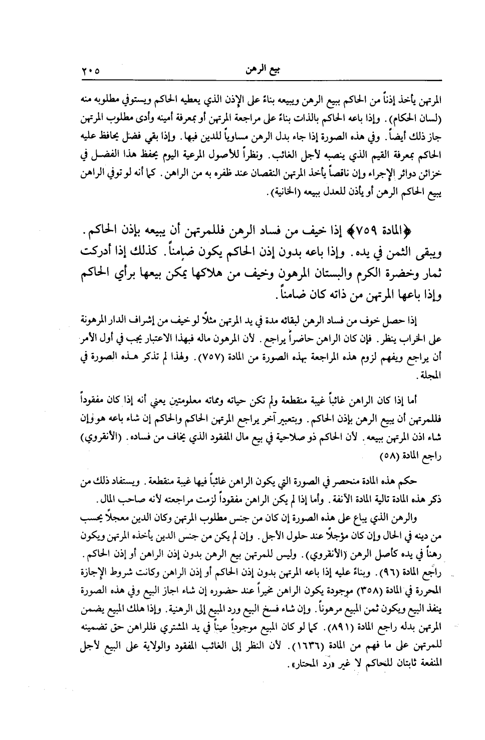 حُكْمُ هَذِهِ الْمَادَّةِ مُنْحَصِرٌ فِي الصُّورَةِ الَّتِي يَكُونُ الرَّاهِنُ غَائِبًا فِيهَا غَيْبَةً مُنْقَطِعَةً. وَيُسْتَفَادُ ذَلِكَ مِنْ ذِكْرِ هَذِهِ الْمَادَّةِ تَالِيَةً الْمَادَّةَ الْآنِفَةَ. وَأَمَّا إذَا لَمْ يَكُنْ الرَّاهِنُ مَفْقُودًا لَزِمَتْ مُرَاجَعَتُهُ لِأَنَّهُ صَاحِبُ الْمَالِ. وَالرَّهْنُ الَّذِي يُبَاعُ عَلَى هَذِهِ الصُّورَةِ إنْ كَانَ مِنْ جِنْسِ مَطْلُوبِ الْمُرْتَهِنِ وَكَانَ الدَّيْنُ مُعَجَّلًا سِرَايَةُ مِنْ دَيْنِهِ فِي الْحَالِ وَإِنْ كَانَ مُؤَجَّلًا عِنْدَ حُلُولِ الْأَجَلِ. وَإِنْ لَمْ يَكُنْ مِنْ جِنْسِ الدَّيْنِ يَأْخُذُهُ الْمُرْتَهِنُ وَيَكُونُ رَهْنًا فِي يَدِهِ كَأَصْلِ الرَّهْنِ (الْأَنْقِرْوِيُّ) . وَلَيْسَ لِلْمُرْتَهِنِ بَيْعُ الرَّهْنِ بِدُونِ إذْنِ الرَّاهِنِ أَوْ إذْنِ الْحَاكِمِ. رَاجِعْ الْمَادَّةَ (96) وَبِنَاءً عَلَيْهِ إذَا بَاعَهُ الْمُرْتَهِنُ بِدُونِ إذْنِ الْحَاكِمِ أَوْ إذْنِ الرَّاهِنِ وَكَانَتْ شُرُوطُ الْإِجَازَةِ الْحُرَّةِ فِي الْمَادَّةِ (358) مَوْجُودَةً يَكُونُ الرَّاهِنُ مُخَيَّرًا عِنْدَ حُضُورِهِ إنْ شَاءَ أَجَازَ الْبَيْعَ وَفِي هَذِهِ الصُّورَةِ يَنْفُذُ الْبَيْعُ وَيَكُونُ ثَمَنُ الْمَبِيعِ مَرْهُونًا. وَإِنْ شَاءَ فَسَخَ الْبَيْعَ وَرَدَّ الْمَبِيعَ إلَى الرَّهْنِيَّةِ وَإِذَا هَلَكَ الْمَبِيعُ يَضْمَنُ الْمُرْتَهِنُ بَدَلَهُ رَاجِعْ الْمَادَّةَ (891) . كَمَا لَوْ كَانَ الْمَبِيعُ مَوْجُودًا عَيْنًا فِي يَدِ الْمُشْتَرِي فَلِلرَّاهِنِ حَقُّ تَضْمِينِهِ لِلْمُرْتَهِنِ عَلَى مَا فُهِمَ مِنْ الْمَادَّةِ (1636) . لِأَنَّ النَّظَرَ إلَى الْغَائِبِ الْمَفْقُودِ وَالْوِلَايَةَ عَلَى الْبَيْعِ لِأَجْلِ الْمَنْفَعَةِ ثَابِتَانِ لِلْحَاكِمِ لَا غَيْرُ " رَدُّ الْمُحْتَارِ "