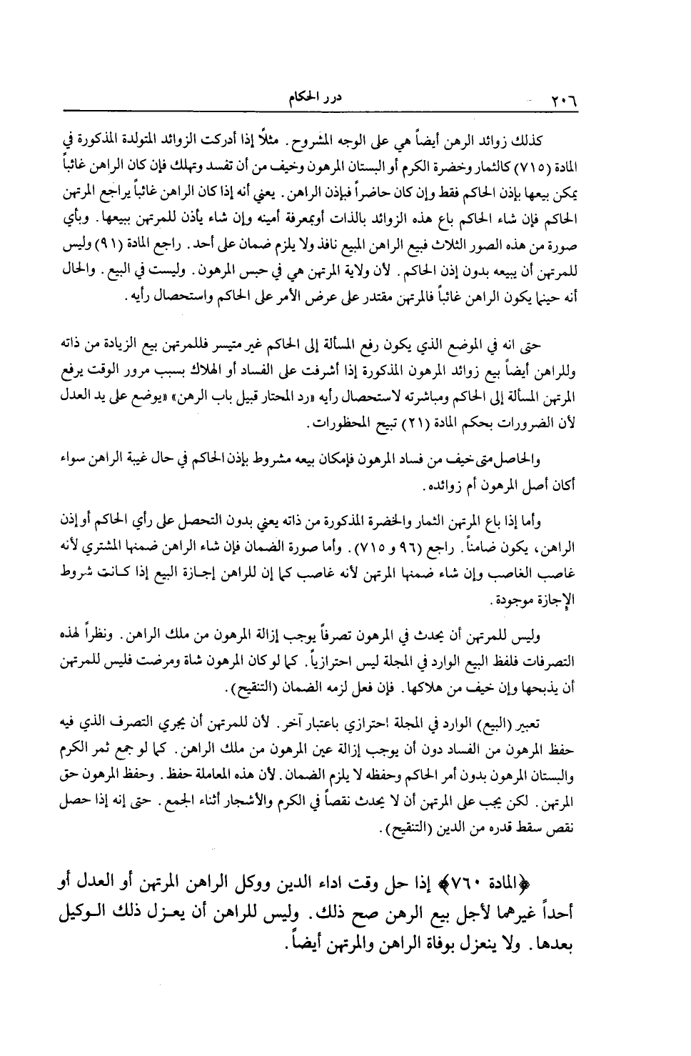 كَذَلِكَ زَوَائِدُ الرَّهْنِ أَيْضًا هِيَ عَلَى الْوَجْهِ الْمَشْرُوحِ. مَثَلًا إذَا أَدْرَكَتْ الزَّوَائِدُ الْمُتَوَلِّدَةُ الْمَذْكُورَةُ فِي الْمَادَّةِ (715) كَالثِّمَارِ وَخُضْرَةِ الْكَرْمِ أَوْ الْبُسْتَانِ الْمَرْهُونِ وَخِيفَ مِنْ أَنْ تَفْسُدَ وَتَهْلِكَ فَإِنْ كَانَ الرَّاهِنُ غَائِبًا يُمْكِنُ بَيْعُهَا بِإِذْنِ الْحَاكِمِ فَقَطْ وَإِنْ كَانَ حَاضِرًا فَبِإِذْنِ الرَّاهِنِ. يَعْنِي أَنَّهُ إذَا كَانَ الرَّاهِنُ غَائِبًا يُرَاجِعُ الْمُرْتَهِنُ الْحَاكِمَ فَإِنْ شَاءَ الْحَاكِمُ بَاعَ هَذِهِ الزَّوَائِدَ بِالذَّاتِ أَوْ بِمَعْرِفَةِ أَمِينِهِ وَإِنْ شَاءَ يَأْذَنُ لِلْمُرْتَهِنِ بِبَيْعِهَا. وَبِأَيِّ صُورَةٍ مِنْ هَذِهِ الصُّوَرِ الثَّلَاثِ فَبَيْعُ الرَّاهِنِ الْمَبِيعَ نَافِذٌ وَلَا يَلْزَمُ ضَمَانٌ عَلَى أَحَدٍ. رَاجِعْ الْمَادَّةَ (91) وَلَيْسَ لِلْمُرْتَهِنِ أَنْ يَبِيعَهُ بِدُونِ إذْنِ الْحَاكِمِ؛ لِأَنَّ وِلَايَةَ الْمُرْتَهِنِ فِي حَبْسِ الْمَرْهُونِ. وَلَيْسَتْ فِي الْبَيْعِ. وَالْحَالُ أَنَّهُ حِينَمَا يَكُونُ الرَّاهِنُ غَائِبًا فَالْمُرْتَهِنُ مُقْتَدِرٌ عَلَى عَرْضِ الْأَمْرِ عَلَى الْحَاكِمِ وَاسْتِحْصَالِ رَأْيِهِ. حَتَّى أَنَّهُ فِي الْمَوْضِعِ الَّذِي يَكُونُ رَفْعُ الْمَسْأَلَةِ إلَى الْحَاكِمِ غَيْرَ مُتَيَسِّرٍ فَلِلْمُرْتَهِنِ بَيْعُ الزِّيَادَةِ مِنْ ذَاتِهِ وَلِلرَّاهِنِ أَيْضًا بَيْعُ زَوَائِدِ الْمَرْهُونِ الْمَذْكُورَةِ إذَا أَشْرَفَتْ عَلَى الْفَسَادِ أَوْ الْهَلَاكِ بِسَبَبِ مُرُورِ الْوَقْتِ يَرْفَعُ الْمُرْتَهِنُ الْمَسْأَلَةَ إلَى الْحَاكِمِ وَمُبَاشَرَتَهُ لِاسْتِحْصَالِ رَأْيِهِ " رَدُّ الْمُحْتَارِ قُبَيْلَ بَابِ الرَّهْنِ " يُوضَعُ عَلَى يَدِ الْعَدْلِ لِأَنَّ الضَّرُورَاتِ بِحُكْمِ الْمَادَّةِ (21) تُبِيحُ الْمَحْظُورَاتِ.