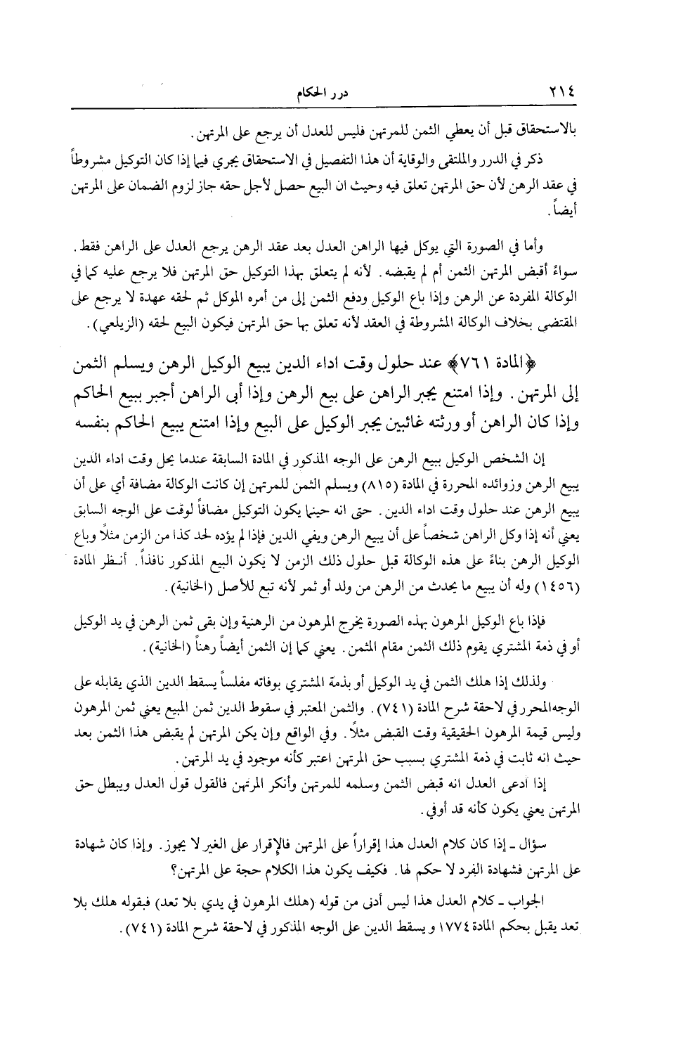 [ (الْمَادَّةُ 761) عِنْدَ حُلُولِ أَدَاءِ الدَّيْنِ يَبِيعُ الْوَكِيلُ الرَّهْنَ وَيُسَلِّمُ الثَّمَنَ إلَى الْمُرْتَهِنِ]