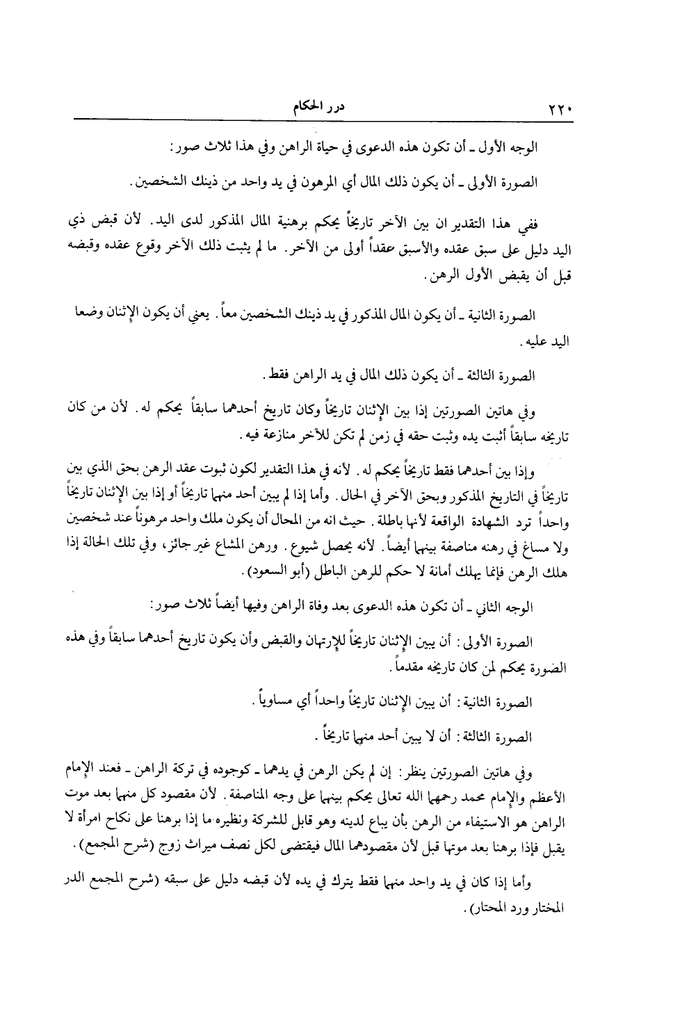 الْوَجْهُ الْأَوَّلُ - أَنْ تَكُونَ هَذِهِ الدَّعْوَى فِي حَيَاةِ الرَّاهِنِ وَفِي هَذَا ثَلَاثُ صُوَرٍ: الصُّورَةُ الْأُولَى - أَنْ يَكُونَ ذَلِكَ الْمَالُ أَيْ الْمَرْهُونُ فِي يَدِ وَاحِدٍ مِنْ ذَيْنِكَ الشَّخْصَيْنِ. فَفِي هَذَا التَّقْدِيرِ إنْ بَيَّنَ الْآخَرُ تَارِيخًا يُحْكَمُ بِرَهْنِيَّةٍ الْمَالِ الْمَذْكُورِ لَدَى الْيَدِ. لِأَنَّ قَبْضَ ذِي الْيَدِ دَلِيلٌ عَلَى سَبْقِ عَقْدِهِ وَالْأَسْبَقُ عَقْدًا أَوْلَى مِنْ الْآخَرِ مَا لَمْ يُثْبِتْ ذَلِكَ الْآخَرُ وُقُوعَ عَقْدِهِ وَقَبْضِهِ قَبْلَ أَنْ يَقْبِضَ الْأَوَّلُ الرَّهْنَ.