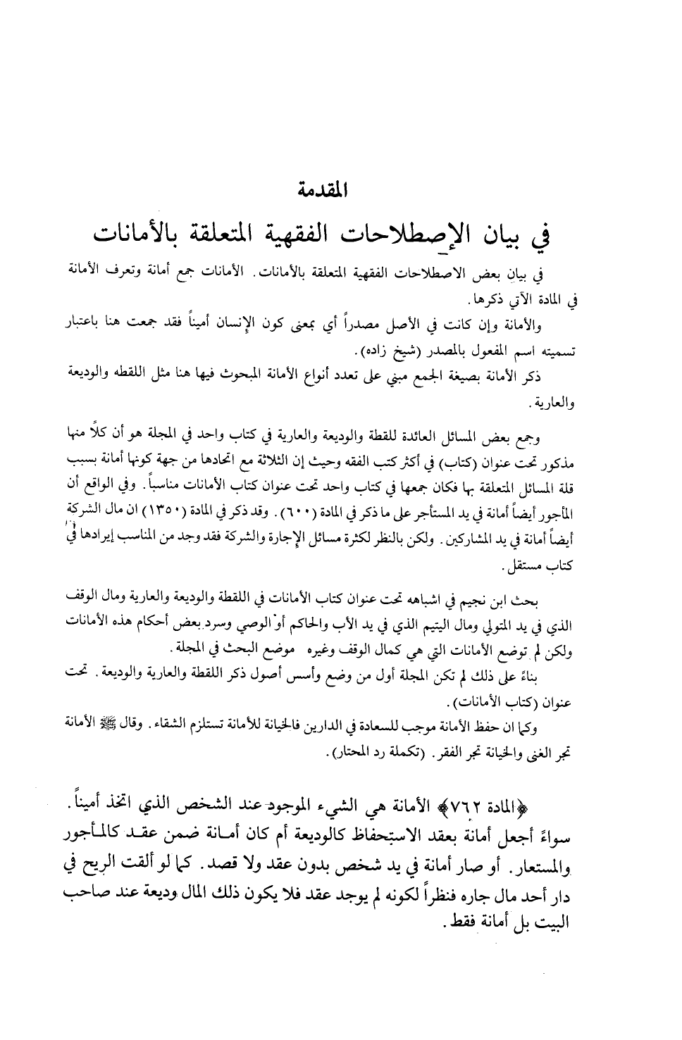 [ (الْمَادَّةُ 762) الْأَمَانَةُ هِيَ الشَّيْءُ الْمَوْجُودُ عِنْدَ الشَّخْصِ الَّذِي اُتُّخِذَ أَمِينًا]