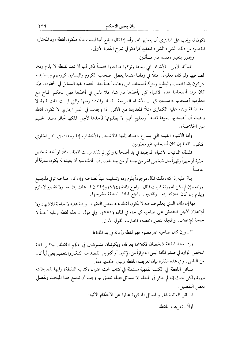 . مَسَائِلُ اللُّقَطَةِ فِي الْكُتُبِ الْفِقْهِيَّةِ مُسْتَقِلَّةٌ فِي كِتَابٍ تَحْتَ عِنْوَانِ (كِتَابِ اللُّقَطَةِ) وَفِيهَا تَفْصِيلَاتٌ مُهِمَّةٌ وَلَكِنْ حَيْثُ إنَّهُ لَمْ يُذْكَرْ فِي الْمَجَلَّةِ إلَّا مَسَائِلُ قَلِيلَةٌ تَتَعَلَّقُ بِهَا وَجَبَ أَنْ نُوَسِّعَ هَذَا الْمَبْحَثَ وَنُفَصِّلَ بَعْضَ التَّفْصِيلِ.