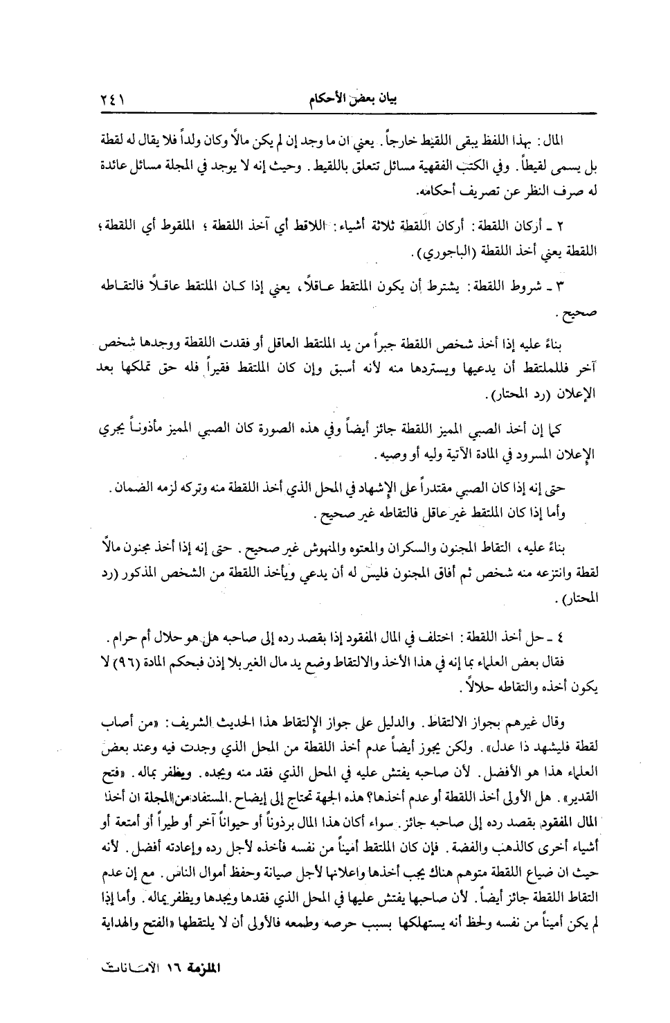 وَقَالَ غَيْرُهُمْ بِجَوَازِ الِالْتِقَاطِ. وَالدَّلِيلُ عَلَى جَوَازِ الِالْتِقَاطِ هَذَا الْحَدِيثُ الشَّرِيفُ: «مَنْ أَصَابَ لُقَطَةً فَلْيُشْهِدْ ذَا عَدْلٍ» . وَلَكِنْ يَجُوزُ أَيْضًا عَدَمُ أَخْذِ اللُّقَطَةِ مِنْ الْمَحِلِّ الَّذِي وُجِدَتْ فِيهِ وَعِنْدَ بَعْضِ الْعُلَمَاءِ هَذَا هُوَ الْأَفْضَلُ. لِأَنَّ صَاحِبَهُ يُفَتِّشُ عَلَيْهِ فِي الْمَحِلِّ الَّذِي فُقِدَ مِنْهُ وَيَجِدُهُ. وَيَظْفَرُ بِمَالِهِ. (فَتْحُ الْقَدِيرِ) . هَلْ الْأَوْلَى أَخْذُ اللُّقَطَةِ أَوْ عَدَمُ أَخْذِهَا؟ هَذِهِ الْجِهَةُ تَحْتَاجُ إلَى إيضَاحٍ. الْمُسْتَفَادُ مِنْ الْمَجَلَّةِ أَنَّ أَخْذَ الْمَالِ الْمَفْقُودِ بِقَصْدِ رَدِّهِ إلَى صَاحِبِهِ جَائِزٌ. سَوَاءٌ أَكَانَ هَذَا الْمَالُ بِرْذَوْنًا أَوْ حَيَوَانًا آخَرَ أَوْ طَيْرًا أَوْ أَمْتِعَةً أَوْ أَشْيَاءَ أُخْرَى كَالذَّهَبِ وَالْفِضَّةِ. فَإِنْ كَانَ الْمُلْتَقِطُ أَمِينًا مِنْ نَفْسِهِ فَأَخْذُهُ لِأَجْلِ رَدِّهِ وَإِعَادَتِهِ أَفْضَلُ؛ لِأَنَّهُ حَيْثُ إنَّ ضَيَاعَ اللُّقَطَةِ مُتَوَهَّمٌ هُنَاكَ يَجِبُ أَخْذُهَا وَإِعْلَانُهَا لِأَجْلِ صِيَانَةِ وَحِفْظِ أَمْوَالِ النَّاسِ. مَعَ أَنَّ عَدَمَ الْتِقَاطِ اللُّقَطَةِ جَائِزٌ أَيْضًا. لِأَنَّ صَاحِبَهَا يُفَتِّشُ عَلَيْهَا فِي الْمَحِلِّ الَّذِي فَقَدَهَا وَيَجِدُهَا وَيَظْفَرُ بِمَالِهِ. وَأَمَّا إذَا لَمْ يَكُنْ أَمِينًا مِنْ نَفْسِهِ وَلَحَظَ أَنَّهُ يَسْتَهْلِكُهَا بِسَبَبِ حِرْصِهِ وَطَمَعِهِ فَالْأَوْلَى أَنْ لَا يَلْتَقِطَهَا (الْفَتْحُ وَالْهِدَايَةُ