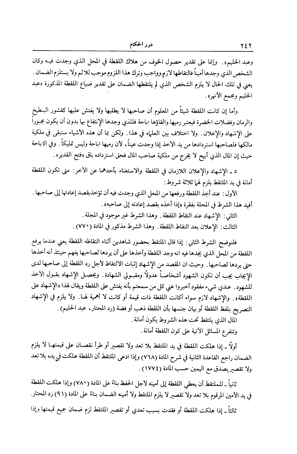 وَعَبْدُ الْحَلِيمِ) ، وَإِنَّمَا عَلَى تَقْدِيرِ حُصُولِ الْخَوْفِ مِنْ هَلَاكِ اللُّقَطَةِ فِي الْمَحِلِّ الَّذِي وُجِدَتْ فِيهِ وَكَانَ الشَّخْصُ الَّذِي وَجَدَهَا أَمِينًا فَالْتِقَاطُهَا لَازِمٌ وَوَاجِبٌ وَتَرْكُ هَذَا اللُّزُومِ مُوجِبٌ لِلْإِثْمِ وَلَا يَسْتَلْزِمُ الضَّمَانَ. يَعْنِي فِي تِلْكَ الْحَالِ لَا يَلْزَمُ الشَّخْصَ الَّذِي لَمْ يَلْتَقِطْهَا الضَّمَانُ عَلَى تَقْدِيرِ ضَيَاعِ اللُّقَطَةِ الْمَذْكُورَةِ (عَبْدُ الْحَلِيمِ وَمَجْمَعُ الْأَنْهُرِ) .