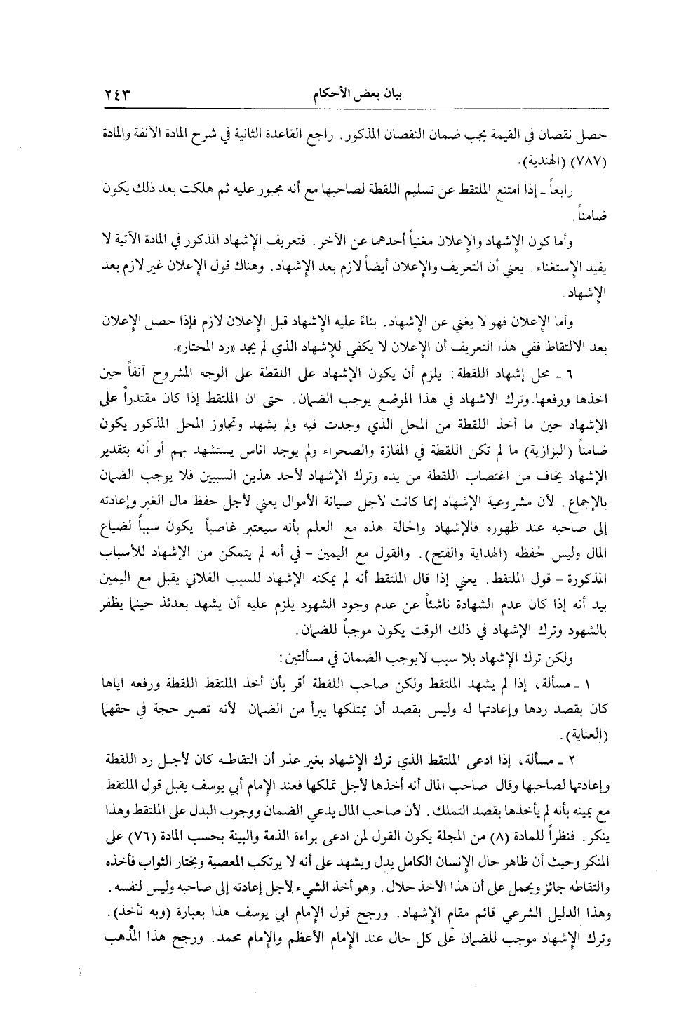 وَأَمَّا كَوْنُ الْإِشْهَادِ وَالْإِعْلَانِ مُغْنِيًا أَحَدُهُمَا عَنْ الْآخَرِ. فَتَعْرِيفُ الْإِشْهَادِ الْمَذْكُورُ فِي الْمَادَّةِ الْآتِيَةِ لَا يُفِيدُ الِاسْتِغْنَاءَ يَعْنِي أَنَّ التَّعْرِيفَ وَالْإِعْلَانَ أَيْضًا لَازِمٌ بَعْدَ الْإِشْهَادِ. وَهُنَاكَ قَوْلٌ الْإِعْلَانُ غَيْرُ لَازِمٍ بَعْدَ الْإِشْهَادِ.