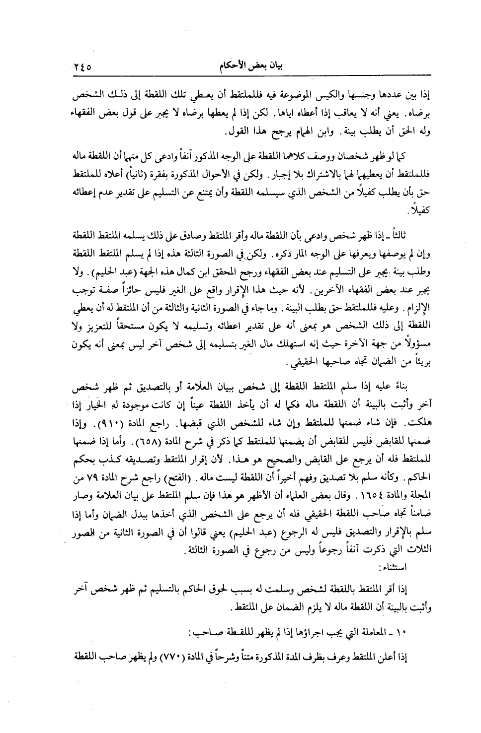 وَقَالَ بَعْضُ الْعُلَمَاءِ إنَّ الْأَظْهَرَ هُوَ هَذَا فَإِنْ سَلَّمَ الْمُلْتَقِطُ عَلَى بَيَانِ الْعَلَامَةِ وَصَارَ ضَامِنًا تُجَاهَ صَاحِبِ اللُّقَطَةِ الْحَقِيقِيِّ فَلَهُ أَنْ يَرْجِعَ عَلَى الشَّخْصِ الَّذِي أَخَذَهَا بِبَدَلِ الضَّمَانِ وَأَمَّا إذَا سَلَّمَ بِالْإِقْرَارِ وَالتَّصْدِيقِ فَلَيْسَ لَهُ الرُّجُوعُ (عَبْدُ الْحَلِيمِ) يَعْنِي قَالُوا: إنَّ فِي الصُّورَةِ الثَّانِيَةِ مِنْ الصُّوَرِ الثَّلَاثِ الَّتِي ذُكِرَتْ آنِفًا رُجُوعًا وَلَيْسَ مِنْ رُجُوعٍ فِي الصُّورَةِ الثَّالِثَةِ.