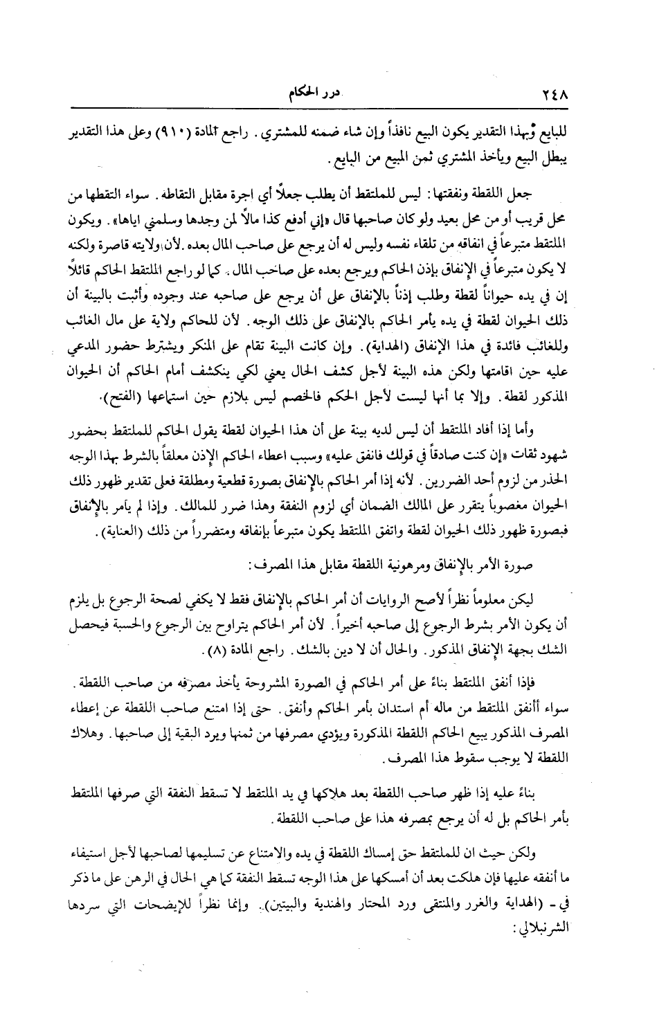 صُورَةُ الْأَمْرِ بِالْإِنْفَاقِ وَمَرْهُونِيَّةِ اللُّقَطَةِ مُقَابِلَ هَذَا الْمَصْرِفِ: لِيَكُنْ مَعْلُومًا نَظَرًا لِأَصَحِّ الرِّوَايَاتِ أَنَّ أَمْرَ الْحَاكِمِ بِالْإِنْفَاقِ فَقَطْ لَا يَكْفِي لِصِحَّةِ الرُّجُوعِ بَلْ يَلْزَمُ أَنْ يَكُونَ الْأَمْرُ بِشَرْطِ الرُّجُوعِ إلَى صَاحِبِهِ أَخِيرًا؛ لِأَنَّ أَمْرَ الْحَاكِمِ يَتَرَاوَحُ بَيْنَ الرُّجُوعِ وَالْحِسْبَةِ فَيَحْصُلُ الشَّكُّ بِجِهَةِ الْإِنْفَاقِ الْمَذْكُورِ. وَالْحَالُ أَنْ لَا دَيْنَ بِالشَّكِّ. رَاجِعْ الْمَادَّةَ (8) . .