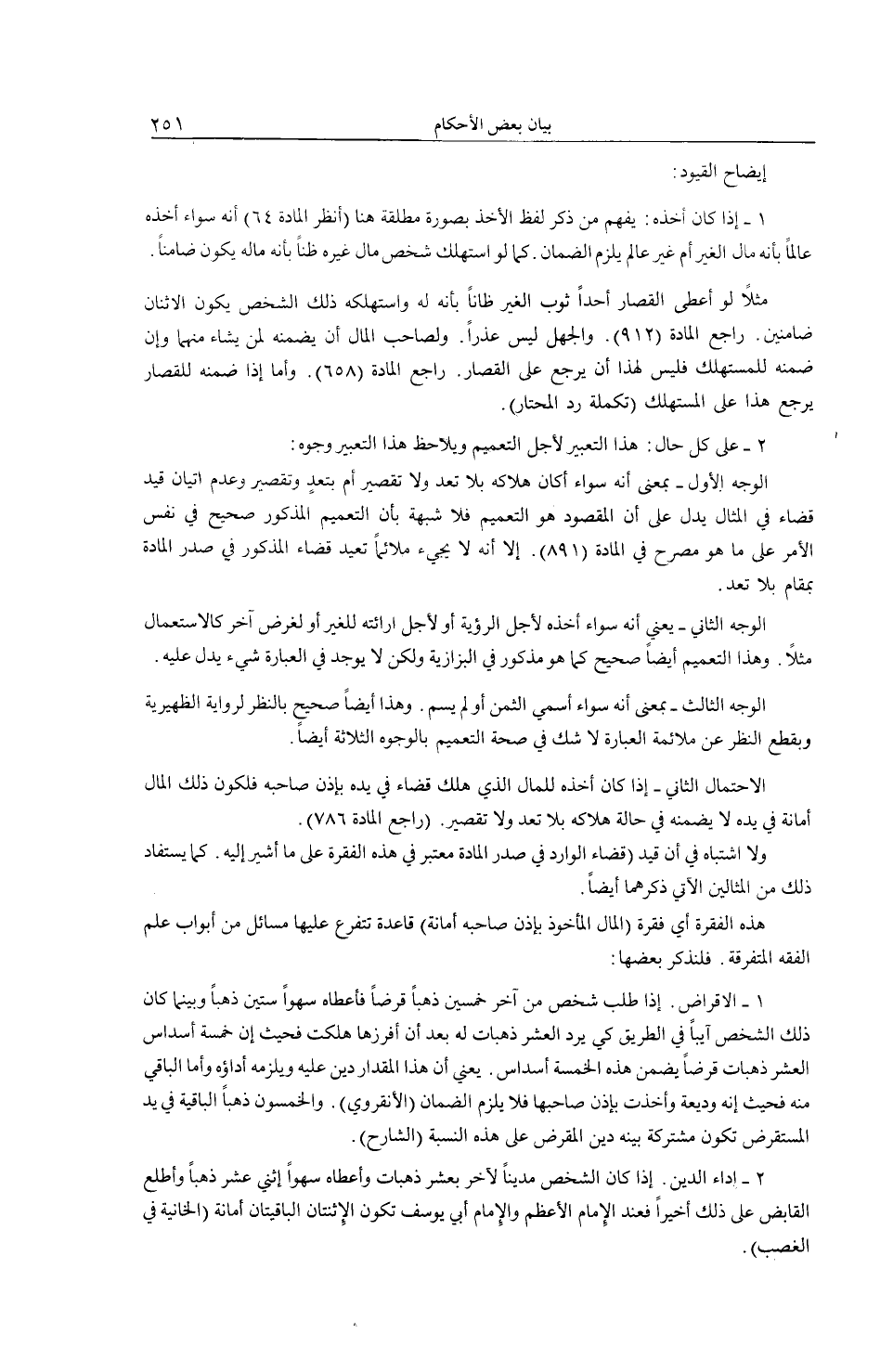 الْوَجْهُ الْأَوَّلُ - بِمَعْنَى أَنَّهُ سَوَاءٌ أَكَانَ هَلَاكُهُ بِلَا تَعَدٍّ وَلَا تَقْصِيرٍ أَمْ بِتَعَدٍّ وَتَقْصِيرٍ وَعَدَمُ إتْيَانِ قَيْدِ قَضَاءً فِي الْمِثَالِ يَدُلُّ عَلَى أَنَّ الْمَقْصُودَ هُوَ التَّعْمِيمُ فَلَا شُبْهَةَ بِأَنَّ التَّعْمِيمَ الْمَذْكُورَ صَحِيحٌ فِي نَفْسِ الْأَمْرِ عَلَى مَا هُوَ مُصَرَّحٌ فِي الْمَادَّةِ (891) . إلَّا أَنَّهُ لَا يَجِيءُ مُلَائِمًا قَيْدَ قَضَاءٍ الْمَذْكُورَ فِي صَدْرِ الْمَادَّةِ بِمَقَامٍ بِلَا تَعَدٍّ.