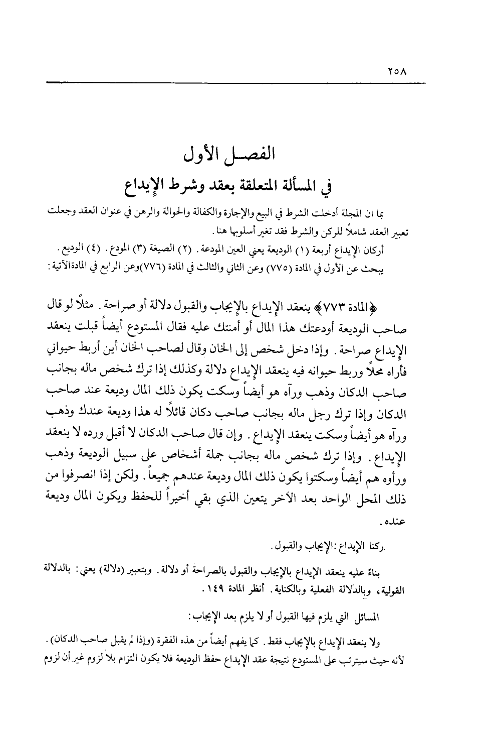 يُبْحَثُ عَنْ الْأَوَّلِ فِي الْمَادَّةِ (775) وَعَنْ الثَّانِي وَالثَّالِثِ فِي الْمَادَّةِ (776) وَعَنْ الرَّابِعِ فِي الْمَادَّةِ الْآتِيَةِ: (الْمَادَّةُ 773) يَنْعَقِدُ الْإِيدَاعُ بِالْإِيجَابِ وَالْقَبُولِ دَلَالَةً أَوْ صَرَاحَةً. مَثَلًا لَوْ قَالَ صَاحِبُ الْوَدِيعَةِ: أَوْدَعْتُكَ هَذَا الْمَالَ أَوْ أَمَّنْتُكَ عَلَيْهِ، فَقَالَ الْمُسْتَوْدِعُ أَيْضًا: قَبِلْتُ يَنْعَقِدُ الْإِيدَاعُ صَرَاحَةً. وَإِذَا دَخَلَ شَخْصٌ إلَى الْخَانِ وَقَالَ لِصَاحِبِ الْخَانِ: أَيْنَ أَرْبِطُ حَيَوَانِي؟ فَأَرَاهُ مَحِلًّا وَرَبَطَ حَيَوَانَهُ فِيهِ يَنْعَقِدُ الْإِيدَاعُ دَلَالَةً وَكَذَلِكَ إذَا تَرَكَ شَخْصٌ مَالَهُ بِجَانِبِ صَاحِبِ الدُّكَّانِ وَذَهَبَ وَرَآهُ هُوَ أَيْضًا وَسَكَتَ يَكُونُ ذَلِكَ الْمَالُ وَدِيعَةً عِنْدَ صَاحِبِ الدُّكَّانِ وَإِذَا تَرَكَ رَجُلٌ مَالَهُ بِجَانِبِ صَاحِبِ دُكَّانٍ قَائِلًا لَهُ: هَذَا وَدِيعَةٌ عِنْدَك، وَذَهَبَ وَرَآهُ هُوَ أَيْضًا وَسَكَتَ يَنْعَقِدُ الْإِيدَاعُ. وَإِنْ قَالَ صَاحِبُ الدُّكَّانِ: لَا أَقْبَلُ، وَرَدَّهُ لَا يَنْعَقِدُ الْإِيدَاعُ. وَإِذَا تَرَكَ شَخْصٌ مَالَهُ بِجَانِبِ جُمْلَةِ أَشْخَاصٍ عَلَى سَبِيلِ الْوَدِيعَةِ وَذَهَبَ وَرَأَوْهُ هُمْ أَيْضًا وَسَكَتُوا يَكُونُ ذَلِكَ الْمَالُ وَدِيعَةً عِنْدَهُمْ جَمِيعًا. وَلَكِنْ إذَا انْصَرَفُوا مِنْ ذَلِكَ الْمَحِلِّ الْوَاحِدُ بَعْدَ الْآخَرِ يَتَعَيَّنُ الَّذِي بَقِيَ أَخِيرًا لِلْحِفْظِ وَيَكُونُ الْمَالُ وَدِيعَةً عِنْدَهُ.