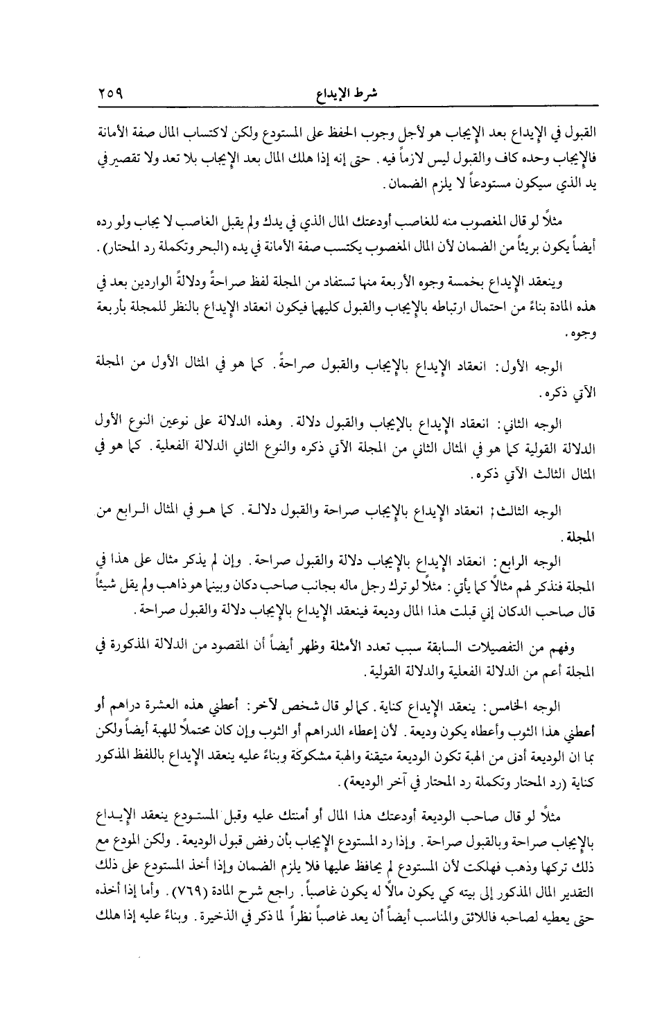 وَيَنْعَقِدُ الْإِيدَاعُ بِخَمْسَةِ وُجُوهٍ الْأَرْبَعَةُ مِنْهَا تُسْتَفَادُ مِنْ الْمَجَلَّةِ لَفْظِ صَرَاحَةً وَدَلَالَةً الْوَارِدَيْنِ بَعْدُ فِي هَذِهِ الْمَادَّةِ بِنَاءً مِنْ احْتِمَالِ ارْتِبَاطِهِ بِالْإِيجَابِ وَالْقَبُولِ كِلَيْهِمَا فَيَكُونُ انْعِقَادُ الْإِيدَاعِ بِالنَّظَرِ لِلْمِجَلَّةِ بِأَرْبَعَةِ وُجُوهٍ: