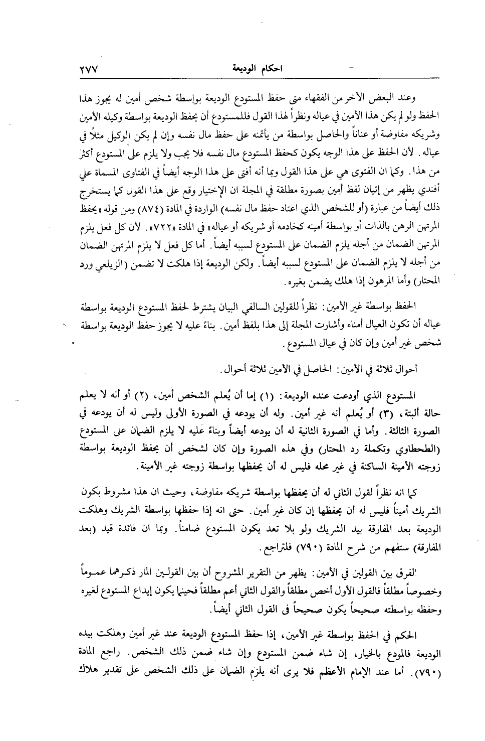 وَعِنْدَ الْبَعْضِ الْآخَرِ مِنْ الْفُقَهَاءِ مَتَى حَفِظَ الْمُسْتَوْدَعُ الْوَدِيعَةَ بِوَاسِطَةِ شَخْصٍ أَمِينٍ لَهُ يَجُوزُ هَذَا الْحِفْظُ وَلَوْ لَمْ يَكُنْ هَذَا الْأَمِينُ فِي عِيَالِهِ وَنَظَرًا لِهَذَا الْقَوْلِ فَلِلْمُسْتَوْدَعِ أَنْ يَحْفَظَ الْوَدِيعَةَ بِوَاسِطَةِ وَكِيلِهِ الْأَمِينِ وَشَرِيكِهِ مُفَاوَضَةً أَوْ عِنَانًا، وَالْحَاصِلُ بِوَاسِطَةِ مَنْ يَأْتَمِنُهُ عَلَى حِفْظِ مَالِ نَفْسِهِ وَإِنْ لَمْ يَكُنْ الْوَكِيلُ مَثَلًا فِي عِيَالِهِ؛ لِأَنَّ الْحِفْظَ عَلَى هَذَا الْوَجْهِ يَكُونُ كَحِفْظِ الْمُسْتَوْدَعِ مَالَ نَفْسِهِ فَلَا يَجِبُ وَلَا يَلْزَمُ عَلَى الْمُسْتَوْدَعِ أَكْثَرُ مِنْ هَذَا. وَكَمَا أَنَّ الْفَتْوَى هِيَ عَلَى هَذَا الْقَوْلِ وَبِمَا أَنَّهُ أَفْتَى عَلَى هَذَا الْوَجْهِ أَيْضًا فِي الْفَتَاوَى الْمُسَمَّاةِ عَلِيٌّ أَفَنْدِي يَظْهَرُ مِنْ إتْيَانِ لَفْظِ أَمِينٍ بِصُورَةٍ مُطْلَقَةٍ فِي الْمَجَلَّةِ أَنَّ الِاخْتِيَارَ وَقَعَ عَلَى هَذَا الْقَوْلِ كَمَا يُسْتَخْرَجُ ذَلِكَ أَيْضًا مِنْ عِبَارَةِ (أَوْ لِلشَّخْصِ الَّذِي اعْتَادَ حِفْظَ مَالِ نَفْسِهِ) الْوَارِدَةِ فِي الْمَادَّةِ (874) وَمِنْ قَوْلِهِ: (يَحْفَظُ الْمُرْتَهِنُ الرَّهْنَ بِالذَّاتِ أَوْ بِوَاسِطَةِ أَمِينِهِ كَخَادِمِهِ أَوْ شَرِيكِهِ أَوْ عِيَالِهِ) فِي الْمَادَّةِ (722) ؛ لِأَنَّ كُلَّ فِعْلٍ يَلْزَمُ الْمُرْتَهِنَ الضَّمَانُ مِنْ أَجْلِهِ يَلْزَمُ الضَّمَانُ عَلَى الْمُسْتَوْدَعِ لِسَبَبِهِ أَيْضًا. أَمَّا كُلُّ فِعْلٍ لَا يَلْزَمُ الْمُرْتَهِنَ الضَّمَانُ مِنْ أَجْلِهِ لَا يَلْزَمُ الضَّمَانُ عَلَى الْمُسْتَوْدَعِ لِسَبَبِهِ أَيْضًا. وَلَكِنَّ الْوَدِيعَةَ إذَا هَلَكَتْ لَا تُضْمَنُ (الزَّيْلَعِيّ وَرَدُّ الْمُحْتَارِ) وَأَمَّا الْمَرْهُونُ إذَا هَلَكَ يُضْمَنُ بِغَيْرِهِ.