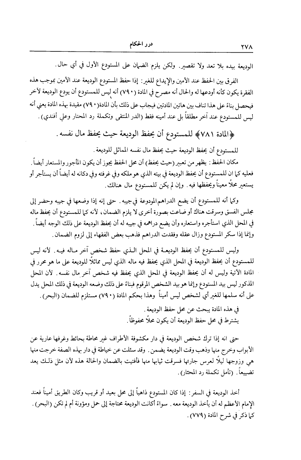 وَلَيْسَ لِلْمُسْتَوْدَعِ أَنْ يَحْفَظَ الْوَدِيعَةَ فِي الْمَحِلِّ الَّذِي حَفِظَ شَخْصٌ آخَرُ مَالَهُ فِيهِ؛ لِأَنَّهُ لَيْسَ لِلْمُسْتَوْدَعِ أَنْ يَحْفَظَ الْوَدِيعَةَ فِي الْمَحِلِّ الَّذِي يَحْفَظُ فِيهِ مَالَهُ الَّذِي لَيْسَ مُمَاثِلًا لِلْوَدِيعَةِ عَلَى مَا هُوَ مُحَرَّرٌ فِي الْمَادَّةِ الْآتِيَةِ وَلَيْسَ لَهُ أَنْ يَحْفَظَ الْوَدِيعَةَ فِي الْمَحِلِّ الَّذِي يَحْفَظُ فِيهِ شَخْصٌ آخَرُ مَالَ نَفْسِهِ؛ لِأَنَّ الْمَحِلَّ الْمَذْكُورَ لَيْسَ بِيَدِ الْمُسْتَوْدَعِ وَإِنَّمَا هُوَ بِيَدِ الشَّخْصِ الْمَرْقُومِ فَبِنَاءً عَلَى ذَلِكَ وَضْعُهُ الْوَدِيعَةَ فِي ذَلِكَ الْمَحِلِّ يَدُلُّ عَلَى أَنَّهُ سَلَّمَهَا لِلْغَيْرِ أَيْ لِشَخْصٍ لَيْسَ أَمِينًا وَهَذَا بِحُكْمِ الْمَادَّةِ (790) مُسْتَلْزِمٌ لِلضَّمَانِ (الْبَحْرُ) .