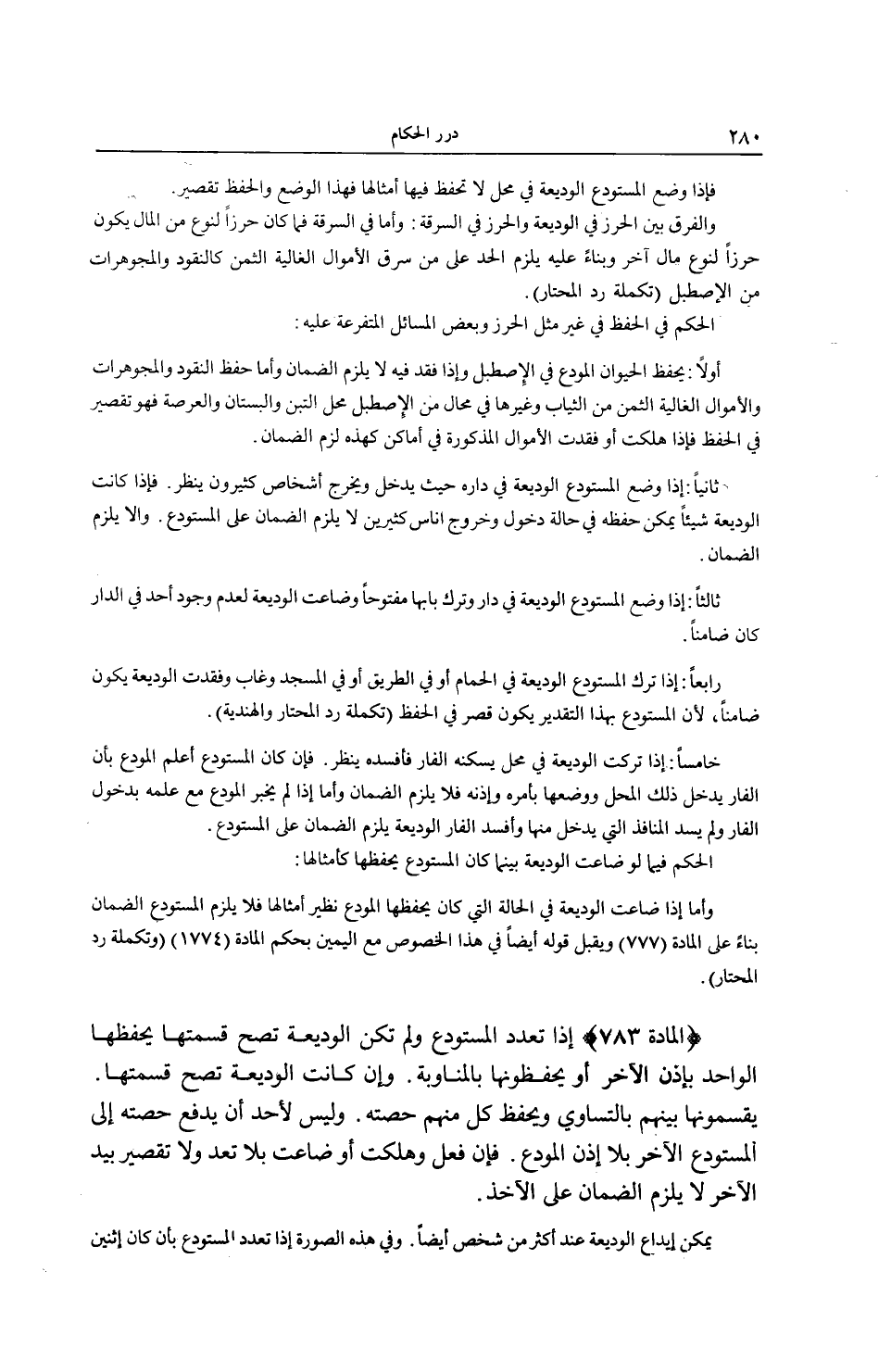 الْحُكْمُ فِيمَا لَوْ ضَاعَتْ الْوَدِيعَةُ بَيْنَمَا كَانَ الْمُسْتَوْدَعُ يَحْفَظُهَا كَأَمْثَالِهَا: وَأَمَّا إذَا ضَاعَتْ الْوَدِيعَةُ فِي الْحَالَةِ الَّتِي كَانَ يَحْفَظُهَا الْمُودَعُ نَظِيرَ أَمْثَالِهَا فَلَا يَلْزَمُ الْمُسْتَوْدَعَ الضَّمَانُ بِنَاءً عَلَى الْمَادَّةِ (777) وَيُقْبَلُ قَوْلُهُ أَيْضًا فِي هَذَا الْخُصُوصِ مَعَ الْيَمِينِ بِحُكْمِ الْمَادَّةِ (1774) (وَتَكْمِلَةُ رَدِّ الْمُحْتَارِ) .