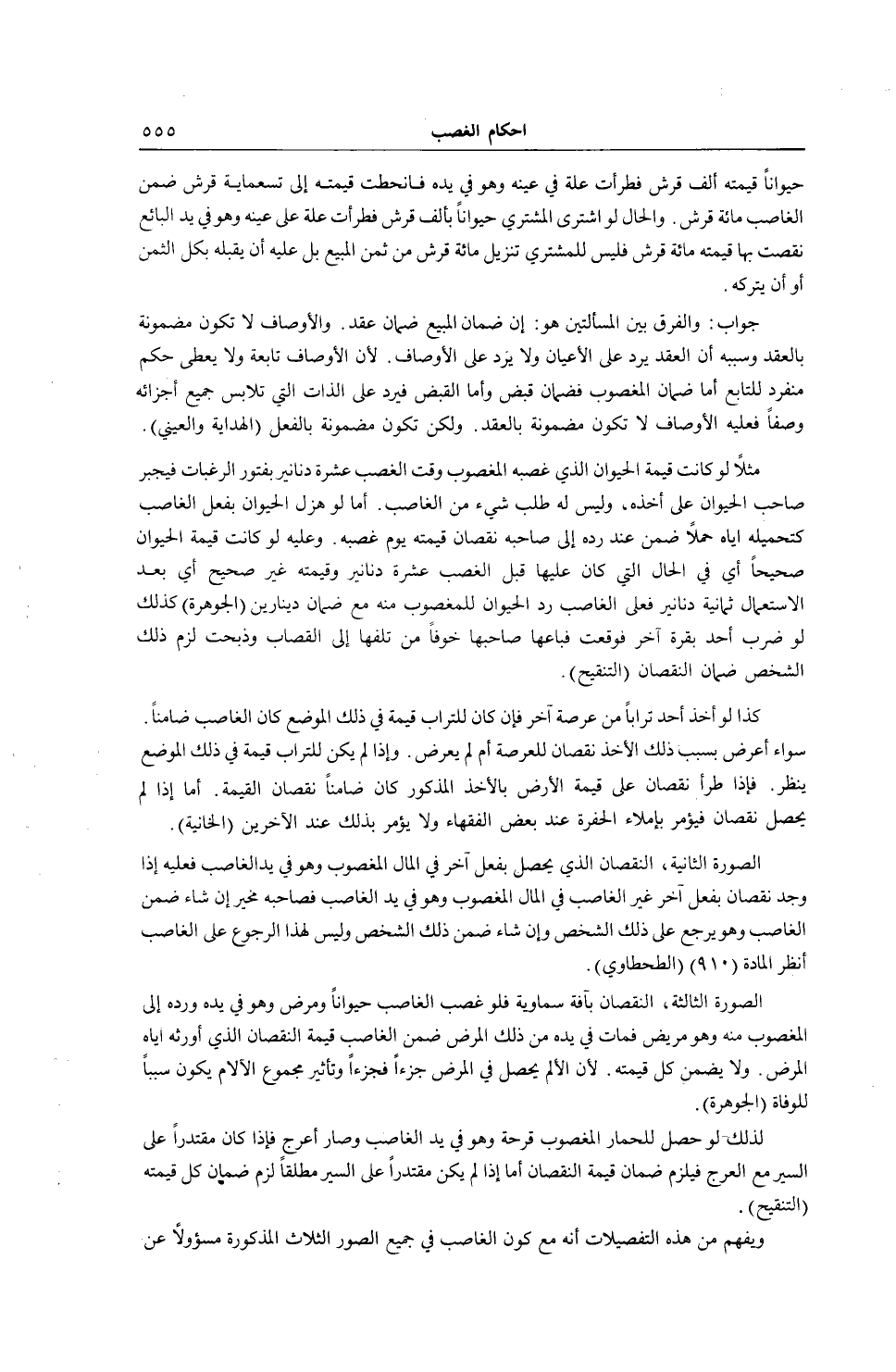 حَيَوَانًا قِيمَتُهُ أَلْفُ قِرْشٍ فَطَرَأَتْ عِلَّةٌ فِي عَيْنِهِ وَهُوَ فِي يَدِهِ فَانْحَطَّتْ قِيمَتُهُ إلَى تِسْعِمِائَةِ قِرْشٍ ضَمِنَ الْغَاصِبُ مِائَةَ قِرْشٍ. وَالْحَالُ لَوْ اشْتَرَى الْمُشْتَرِي حَيَوَانًا بِأَلْفِ قِرْشٍ فَطَرَأَتْ عِلَّةٌ عَلَى عَيْنِهِ وَهُوَ فِي يَدِ الْبَائِعِ نَقَصَتْ بِهَا قِيمَتُهُ مِائَةَ قِرْشٍ فَلَيْسَ لِلْمُشْتَرِي تَنْزِيلُ مِائَةِ قِرْشٍ مِنْ ثَمَنِ الْمَبِيعِ بَلْ عَلَيْهِ أَنْ يَقْبَلَهُ بِكُلِّ الثَّمَنِ أَوْ أَنْ يَتْرُكَهُ. جَوَابٌ: وَالْفَرْقُ بَيْنَ الْمَسْأَلَتَيْنِ هُوَ: أَنَّ ضَمَانَ الْمَبِيعِ ضَمَانُ عَقْدٍ. وَالْأَوْصَافُ لَا تَكُونُ مَضْمُونَةً بِالْعَقْدِ وَسَبَبُهُ أَنَّ الْعَقْدَ يَرِدُ عَلَى الْأَعْيَانِ وَلَا يَرِدُ عَلَى الْأَوْصَافِ. لِأَنَّ الْأَوْصَافَ تَابِعَةٌ وَلَا يُعْطَى حُكْمٌ مُنْفَرِدٌ لِلتَّابِعِ أَمَّا ضَمَانُ الْمَغْصُوبِ فَضَمَانُ قَبْضٍ وَأَمَّا الْقَبْضُ فَيَرِدُ عَلَى الذَّاتِ الَّتِي تُلَابِسُ جَمِيعَ أَجْزَائِهِ وَصْفًا فَعَلَيْهِ الْأَوْصَافُ لَا تَكُونُ مَضْمُونَةً بِالْعَقْدِ وَلَكِنْ تَكُونُ مَضْمُونَةً بِالْفِعْلِ (الْهِدَايَةُ وَالْعَيْنِيُّ) .