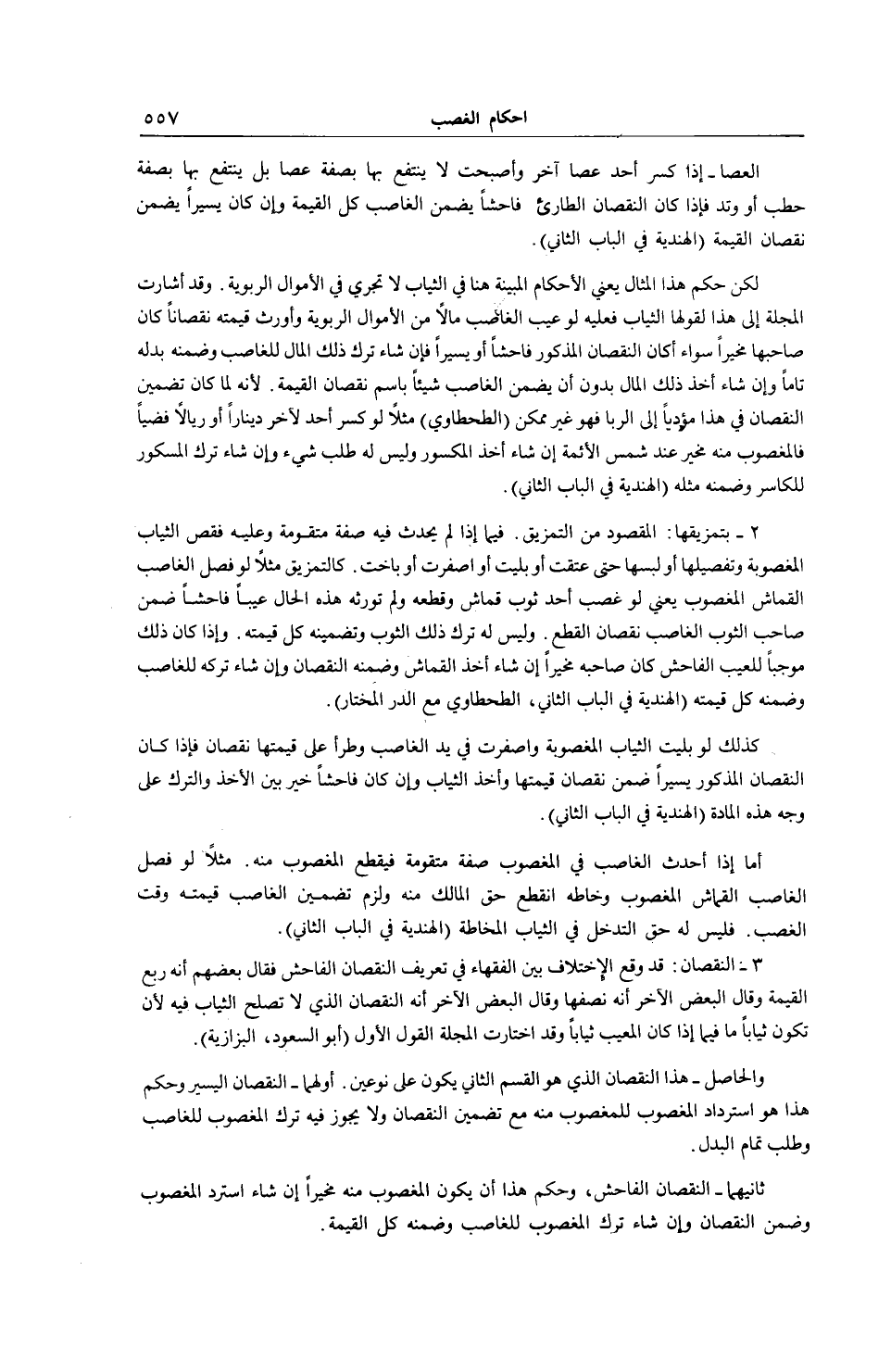 لَكِنَّ حُكْمَ هَذَا الْمِثَالِ يَعْنِي الْأَحْكَامَ الْمُبَيَّنَةَ هُنَا فِي الثِّيَابِ لَا تَجْرِي فِي الْأَمْوَالِ الرِّبَوِيَّةِ. وَقَدْ أَشَارَتْ الْمَجَلَّةُ إلَى هَذَا لِقَوْلِهَا الثِّيَابُ فَعَلَيْهِ لَوْ عَيَّبَ الْغَصْبُ مَالًا مِنْ الْأَمْوَالِ الرِّبَوِيَّةِ وَأَوْرَثَ قِيمَتَهُ نُقْصَانًا كَانَ صَاحِبُهَا مُخَيَّرًا سَوَاءٌ أَكَانَ النُّقْصَانُ الْمَذْكُورُ فَاحِشًا أَوْ يَسِيرًا فَإِنْ شَاءَ تَرَكَ ذَلِكَ الْمَالَ لِلْغَاصِبِ وَضَمَّنَهُ بَدَلَهُ تَامًّا وَإِنْ شَاءَ أَخَذَ ذَلِكَ الْمَالَ بِدُونِ أَنْ يَضْمَنَ الْغَاصِبَ شَيْئًا بِاسْمِ نُقْصَانِ الْقِيمَةِ لِأَنَّهُ لَمَّا كَانَ تَضْمِينُ النُّقْصَانِ فِي هَذَا مُؤَدِّيًا إلَى الرِّبَا فَهُوَ غَيْرُ مُمْكِنٍ (الطَّحْطَاوِيُّ) مَثَلًا لَوْ كَسَرَ أَحَدٌ لِآخَرَ دِينَارًا أَوْ رِيَالًا فِضِّيًّا فَالْمَغْصُوبُ مِنْهُ مُخَيَّرٌ عِنْدَ شَمْسِ الْأَئِمَّةِ إنْ شَاءَ أَخَذَ الْمَكْسُورَ وَلَيْسَ لَهُ طَلَبُ شَيْءٍ وَإِنْ شَاءَ تَرَكَ الْمَكْسُورَ لِلْكَاسِرِ وَضَمَّنَهُ مِثْلَهُ (الْهِنْدِيَّةُ فِي الْبَابِ الثَّانِي) .