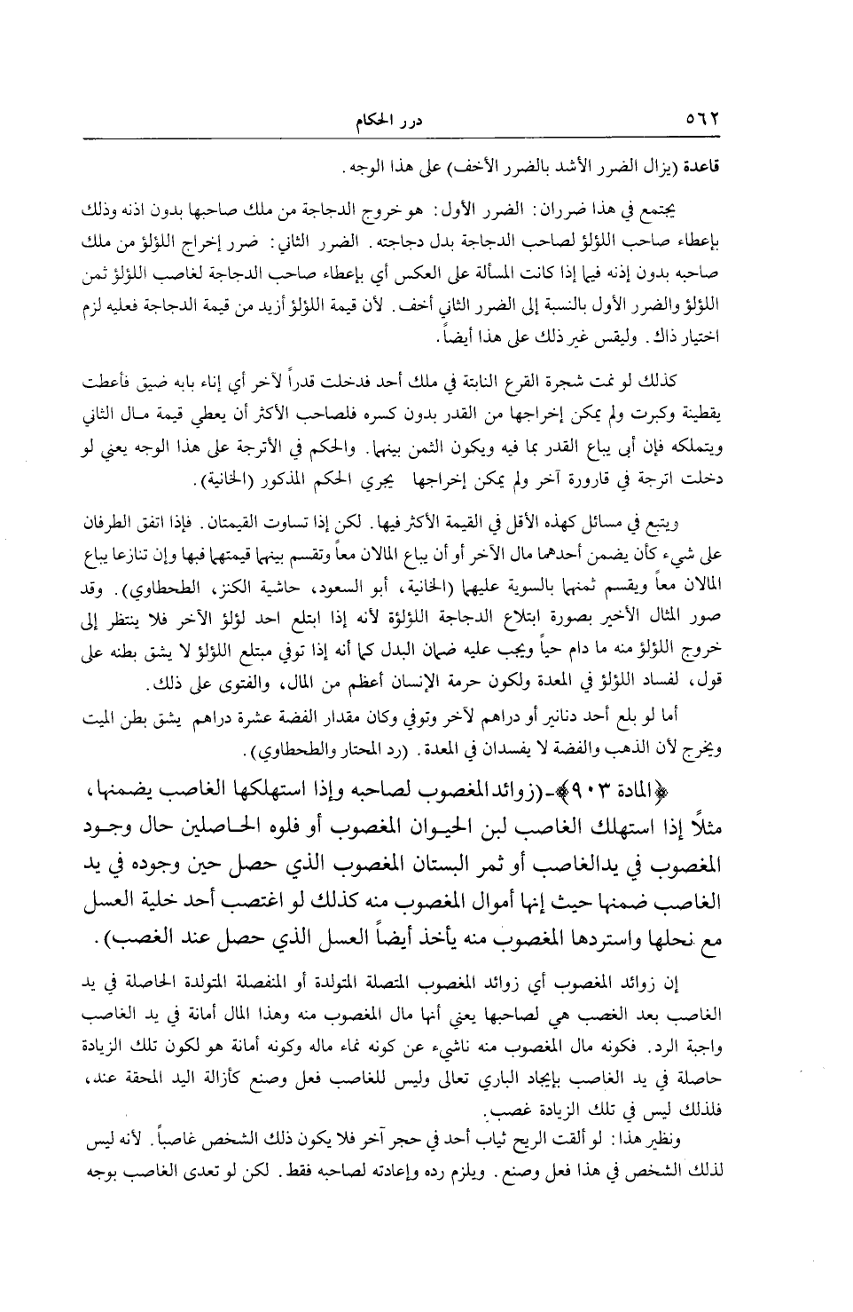 (الْمَادَّةُ 903) - (زَوَائِدُ الْمَغْصُوبِ لِصَاحِبِهِ وَإِذَا اسْتَهْلَكَهَا الْغَاصِبُ يَضْمَنُهَا، مَثَلًا إذَا اسْتَهْلَكَ الْغَاصِبُ لَبَنَ الْحَيَوَانِ الْمَغْصُوبِ أَوْ فَلُوَّهُ الْحَاصِلَيْنِ حَالَ وُجُودِ الْمَغْصُوبِ فِي يَدِ الْغَاصِبِ أَوْ ثَمَرَ الْبُسْتَانِ الْمَغْصُوبِ الَّذِي حَصَلَ حِينَ وُجُودِهِ فِي يَدِ الْغَاصِبِ ضَمِنَهَا حَيْثُ إنَّهَا أَمْوَالُ الْمَغْصُوبِ مِنْهُ كَذَلِكَ لَوْ اغْتَصَبَ أَحَدٌ خَلِيَّةَ الْعَسَلِ مَعَ نَحْلِهَا وَاسْتَرَدَّهَا الْمَغْصُوبُ مِنْهُ يَأْخُذُ أَيْضًا الْعَسَلَ الَّذِي حَصَلَ عِنْدَ الْغَصْبِ) إنَّ زَوَائِدَ الْمَغْصُوبِ أَيْ زَوَائِدَ الْمَغْصُوبِ الْمُتَّصِلَةَ الْمُتَوَلِّدَةَ أَوْ الْمُنْفَصِلَةَ الْمُتَوَلِّدَةَ الْحَاصِلَةَ فِي يَدِ الْغَاصِبِ بَعْدَ الْغَصْبِ هِيَ لِصَاحِبِهَا يَعْنِي أَنَّهَا مَالُ الْمَغْصُوبِ مِنْهُ وَهَذَا الْمَالُ أَمَانَةٌ فِي يَدِ الْغَاصِبِ وَاجِبَةُ الرَّدِّ. فَكَوْنُهُ مَالَ الْمَغْصُوبِ مِنْهُ نَاشِئٌ عَنْ كَوْنِهِ نَمَاءَ مَالٍ وَكَوْنُهُ أَمَانَةً هُوَ لِكَوْنِ تِلْكَ الزِّيَادَةِ حَاصِلَةً فِي يَدِ الْغَاصِبِ بِإِيجَادِ الْبَارِي تَعَالَى وَلَيْسَ لِلْغَاصِبِ فِعْلٌ وَصُنْعٌ كَإِزَالَةِ الْيَدِ الْمُحِقَّةِ عِنْدَهُ فَلِذَلِكَ لَيْسَ فِي تِلْكَ الزِّيَادَةِ غَصْبٌ. وَنَظِيرُ هَذَا: لَوْ أَلْقَتْ الرِّيحُ ثِيَابَ أَحَدٍ فِي حِجْرِ آخَرَ فَلَا يَكُونُ ذَلِكَ الشَّخْصُ غَاصِبًا لِأَنَّهُ لَيْسَ لِذَلِكَ الشَّخْصِ فِي هَذَا فِعْلٌ وَصُنْعٌ. وَيَلْزَمُ رَدُّهُ وَإِعَادَتُهُ لِصَاحِبِهِ فَقَطْ. لَكِنْ لَوْ تَعَدَّى الْغَاصِبُ بِوَجْهٍ